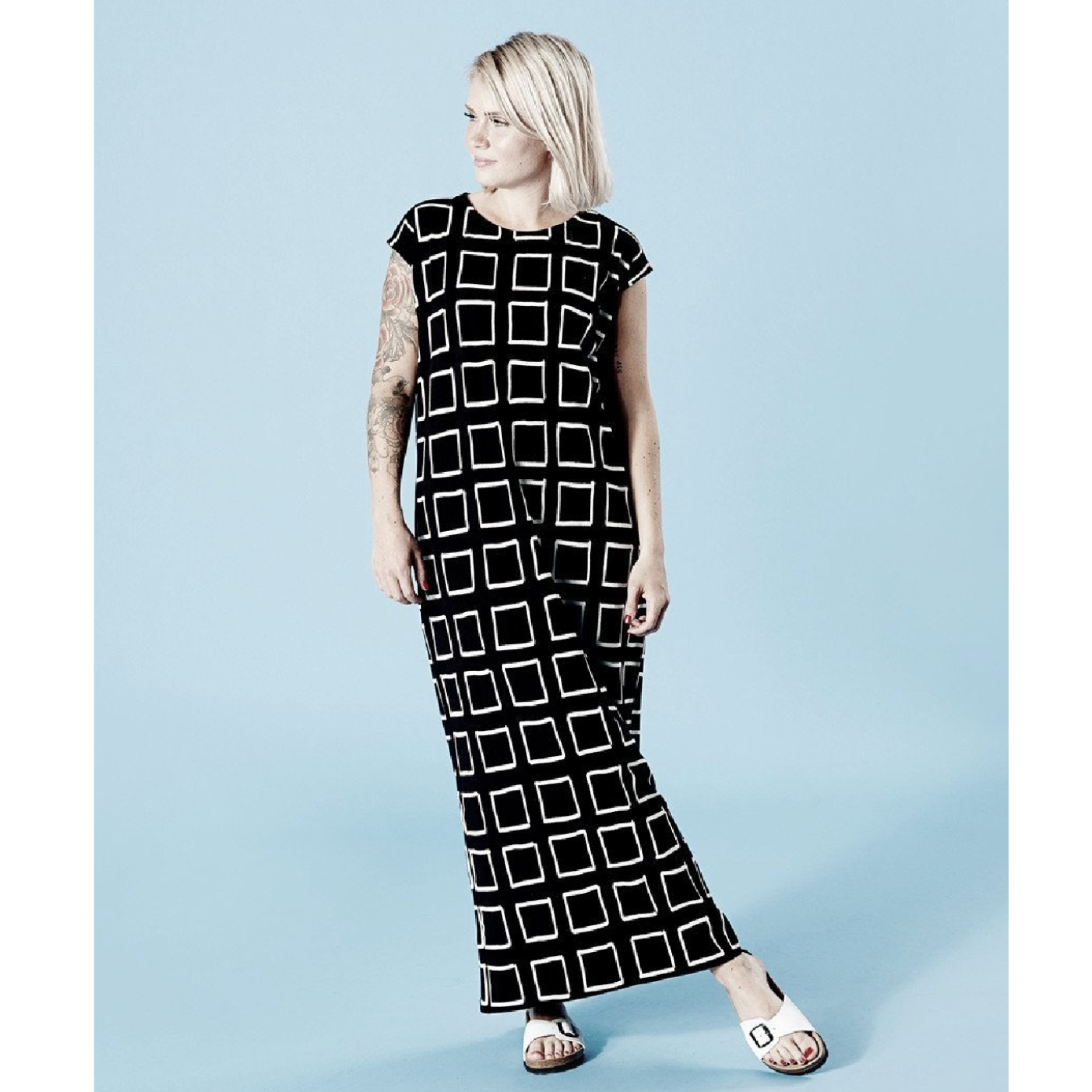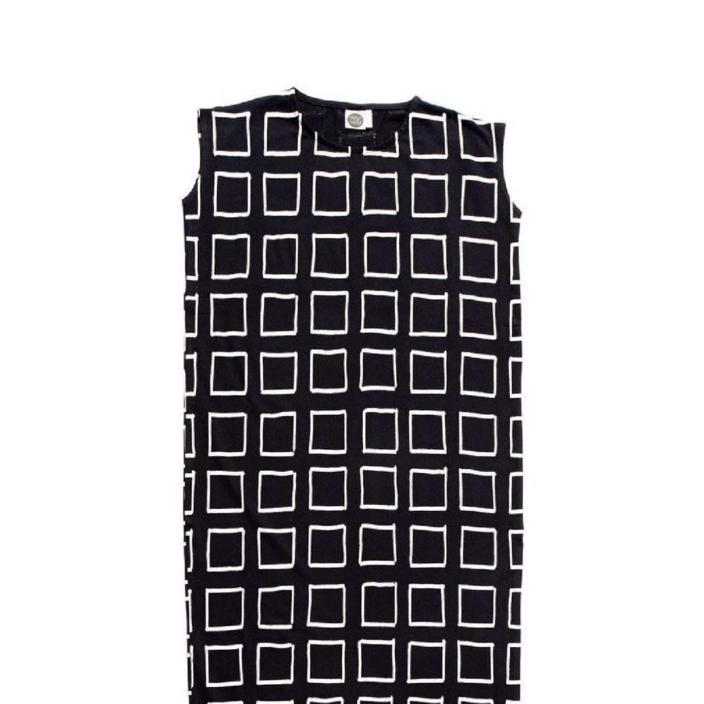 Long, black tricot dress featuring a white Frames all-over pattern.
