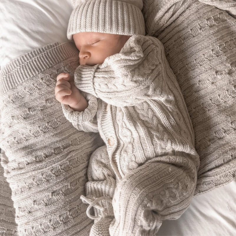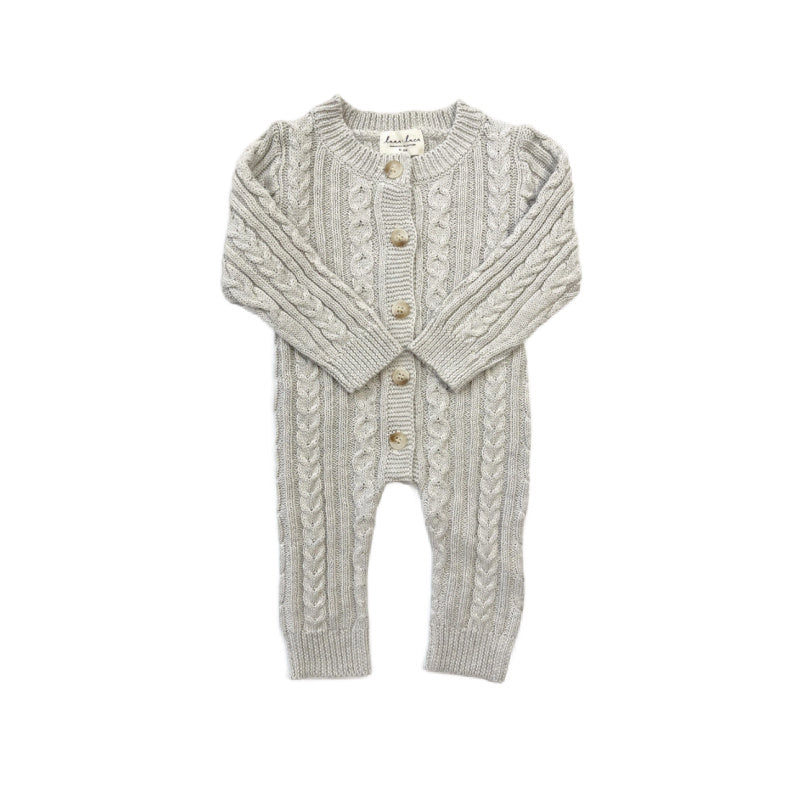 This classic baby jumpsuit in a natural color, features a beautifully textured mixture of cable knit stitches for a darling sense of character and charm. The timeless design of the cables add a touch of sophistication to this adorable outfit, making it perfect for any occasion, from special events to everyday wear.