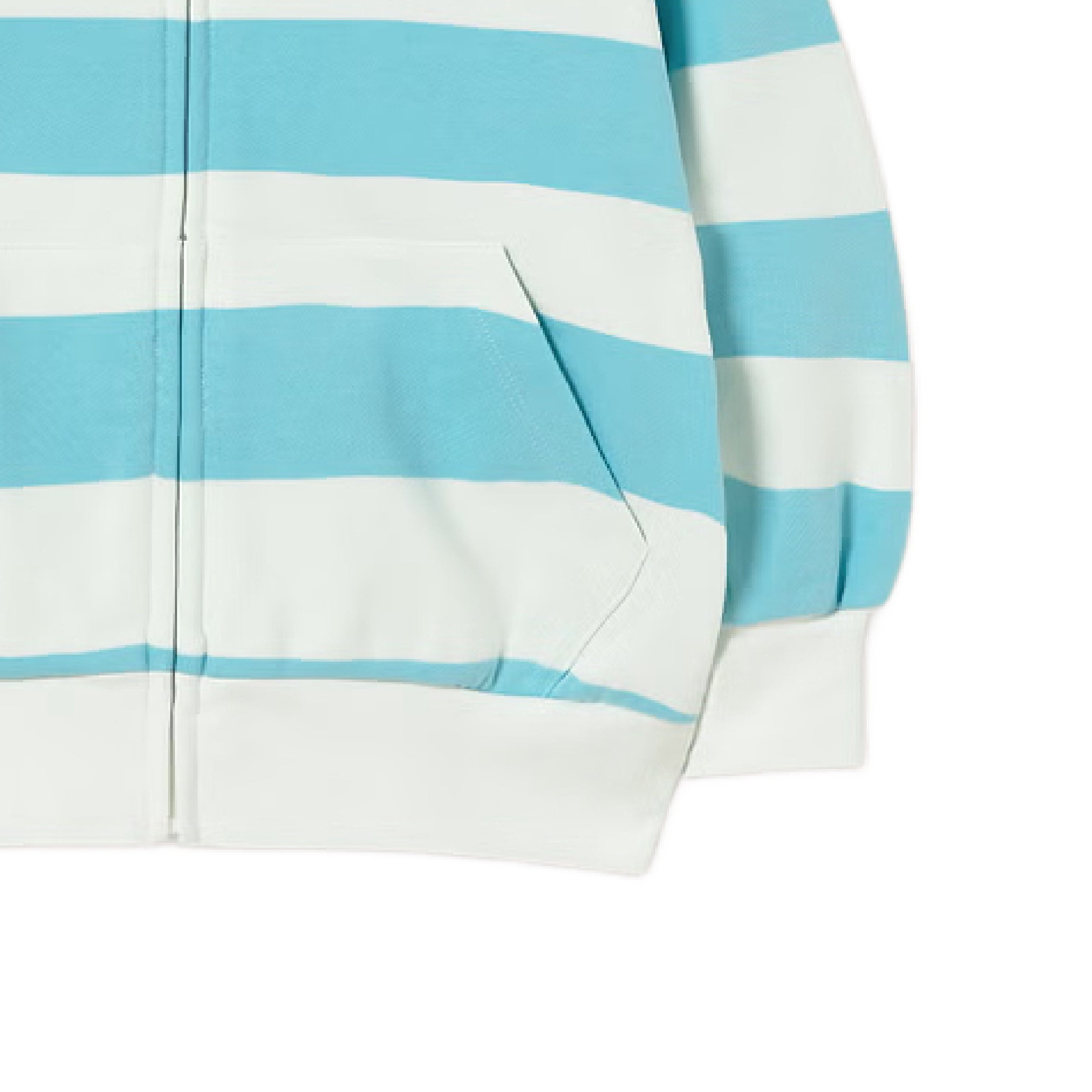 This Cyan Stripes hoodie has a classic and functional design features a front zipper, kangaroo pocket, and ribbed cuffs and hem for a comfortable and durable fit. The soft, natural fabric provides warmth and coziness, making it a perfect choice for any occasion. Ideal for a casual or sporty look, this hoodie blends sustainability with contemporary style for everyday wear.