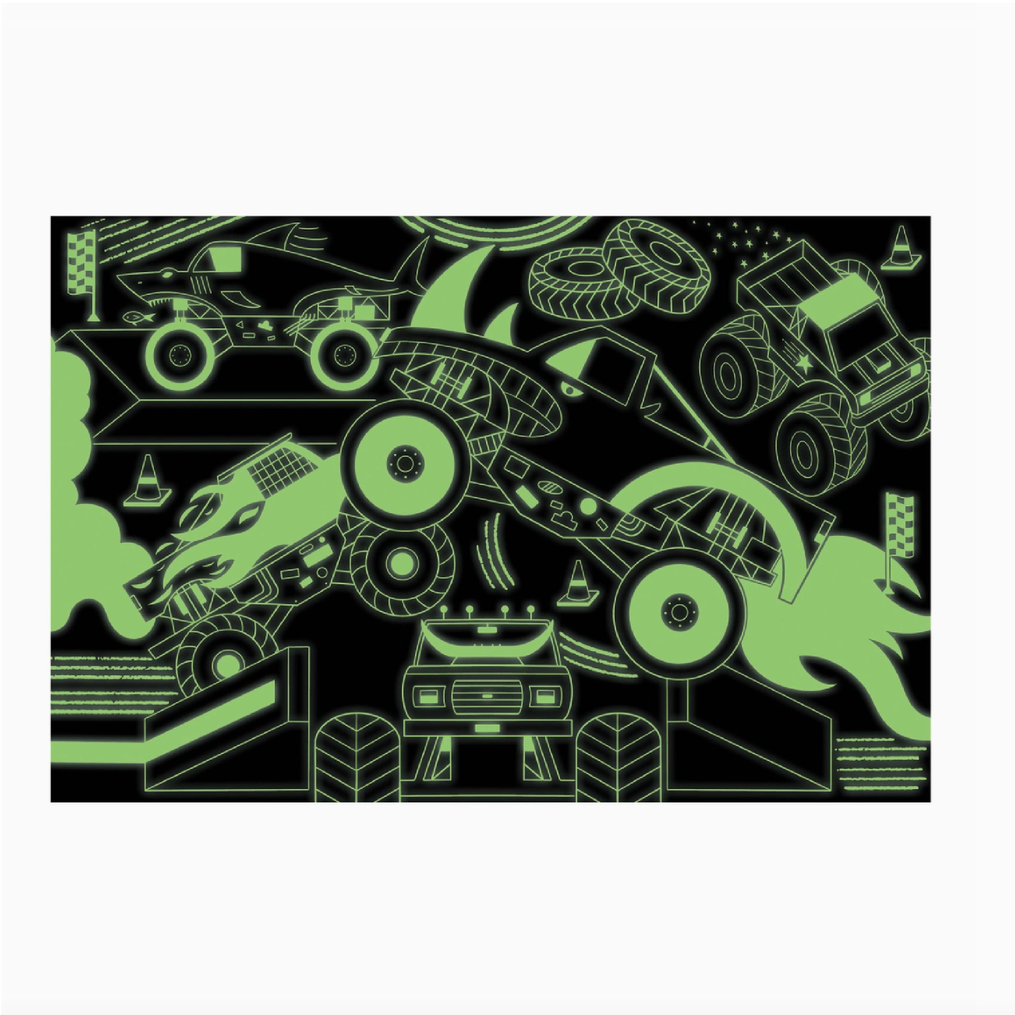 Yes! It's glows in the dark! Piece together a scene full of monster trucks and cars with this super fun 100 piece puzzle! Put it together, frame it, and use it as a super cool piece of decor!