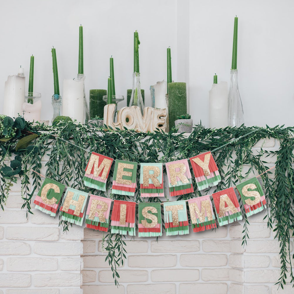 This gorgeous garland, comprised of 4 different sections, is the perfect way to share merry wishes for the holidays. It is beautifully designed and crafted in Christmas colors, and has fringed details and shimmering ECO glitter letters, for a sensational effect. Hang the 4 garlands together, or separately, depending on the look you want.