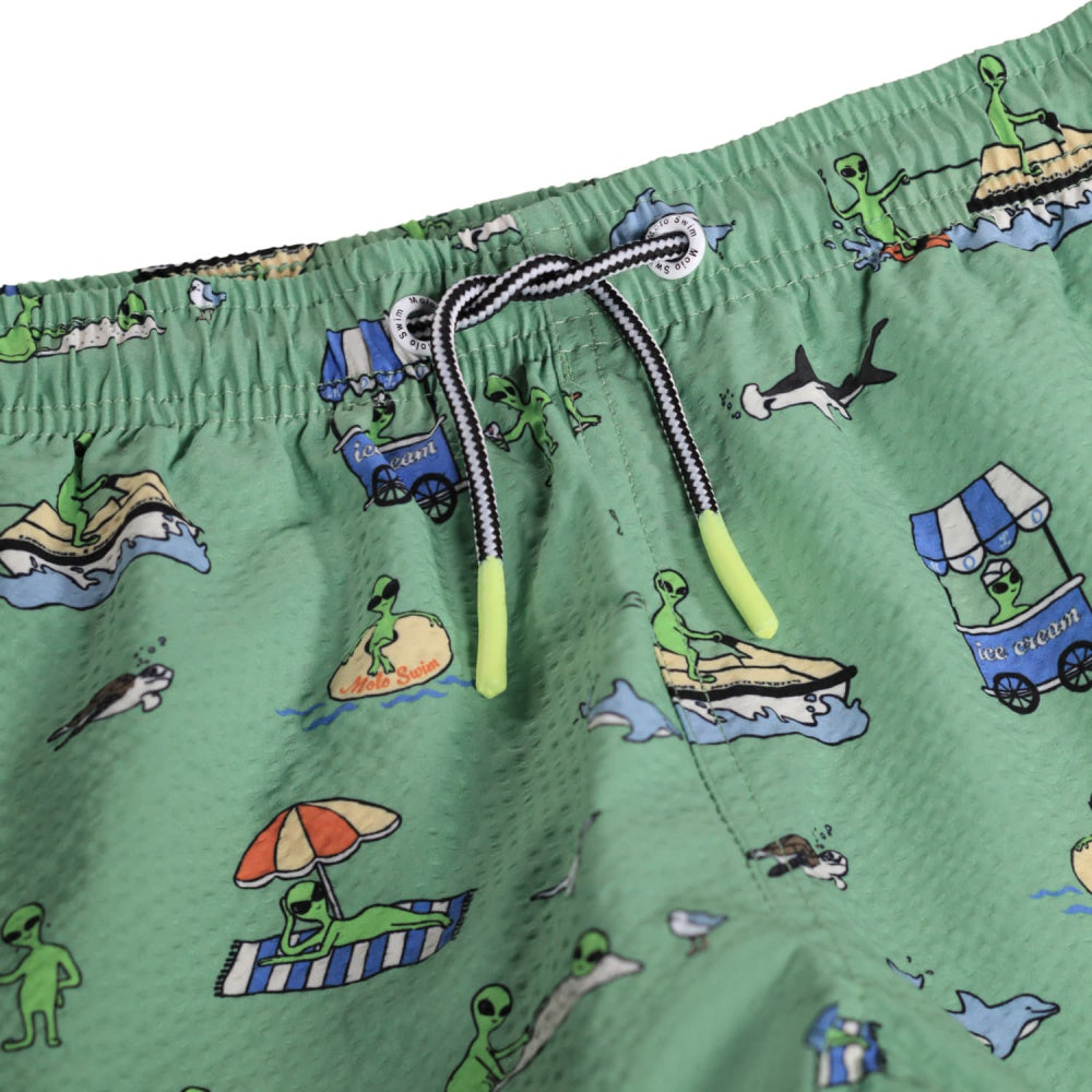 Unique and playful aliens on vacation print swim shorts for children, with UV50+ protection. It has a relaxed fit, inner shorts, and elastic and drawstring at the waist for easy on and off. This Molo product contains a minimum of 50% GRS-certified polyester recycled from post-consumer waste.