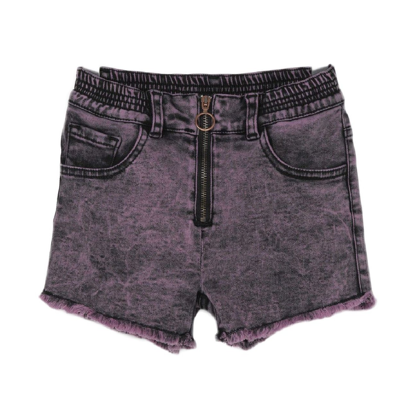 A rad and purple distressed denim short for your modern babe. Features a zipper front and elastic waistband.