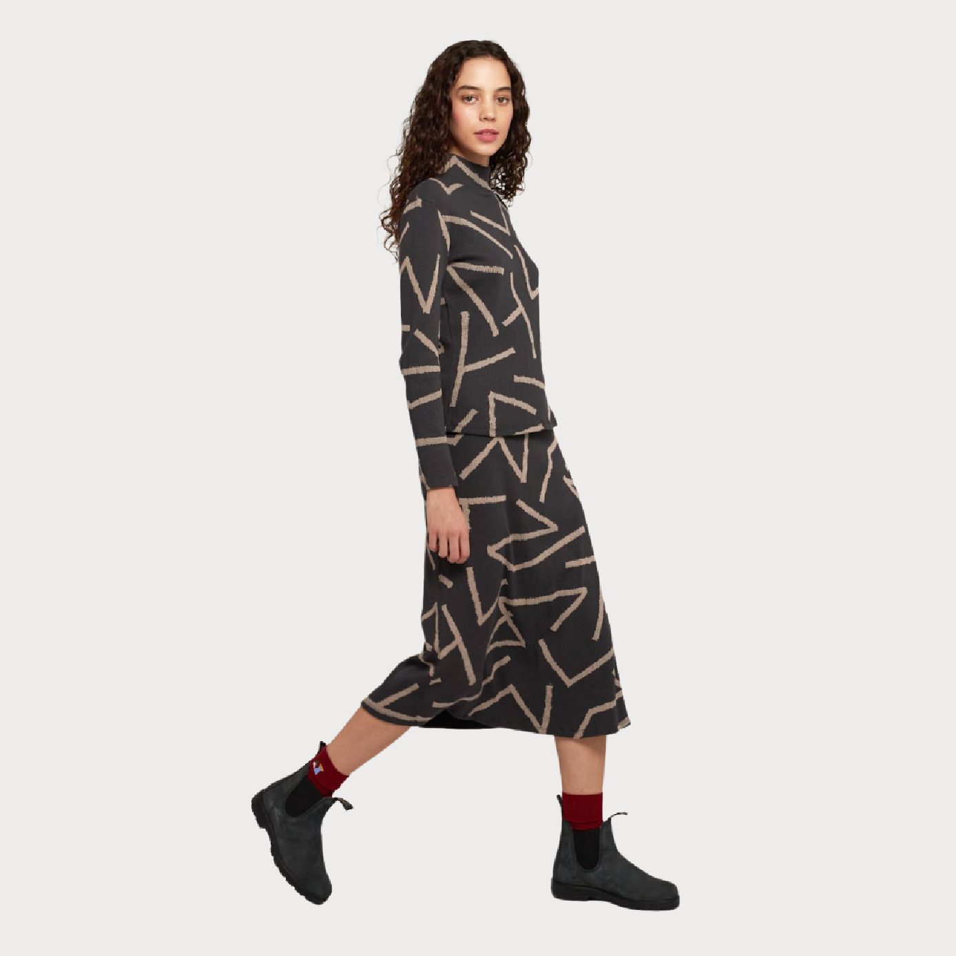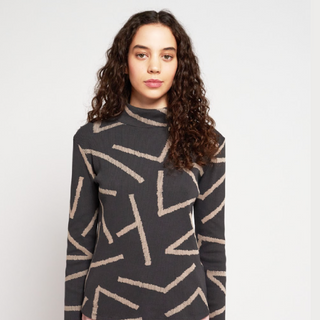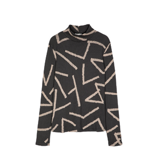 A modern and chic turtleneck featuring an abstract print on a black base, turtleneck and longsleeves.