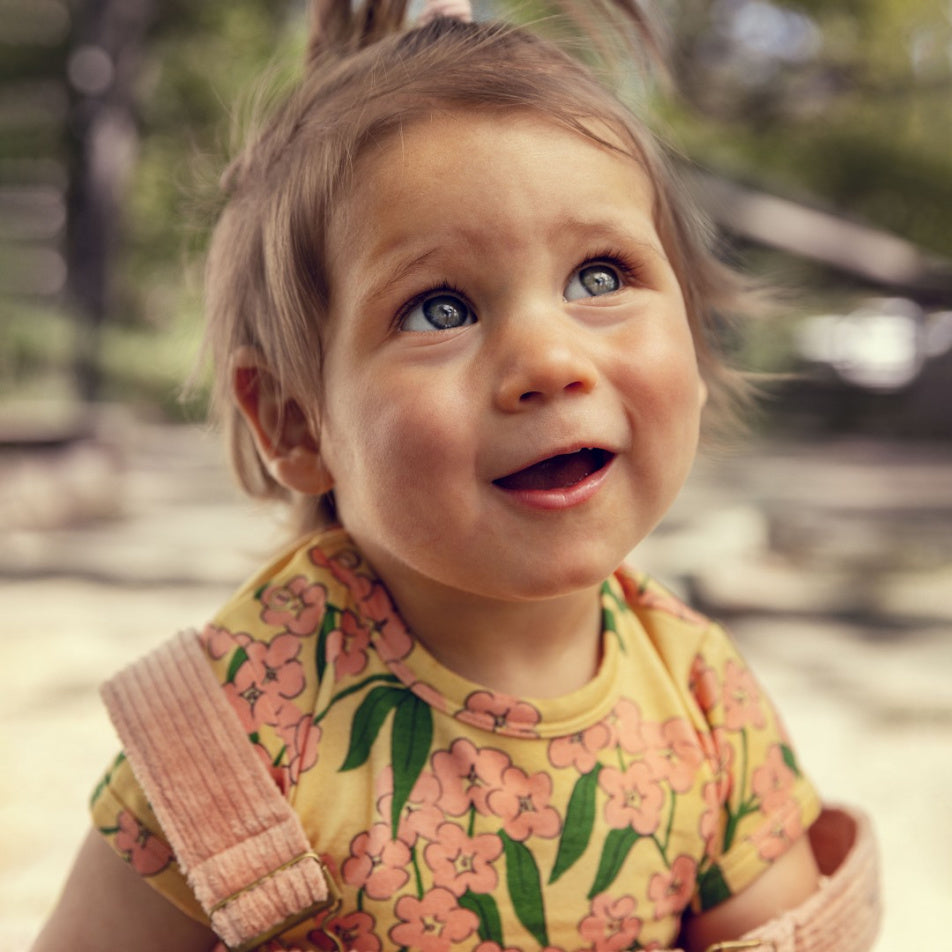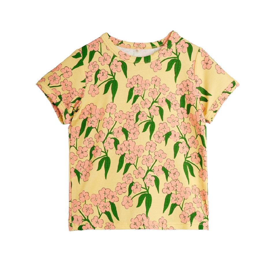 A beautiful and sweet short sleeve tee shirt with an all over pink and green flower design on a yellow base.