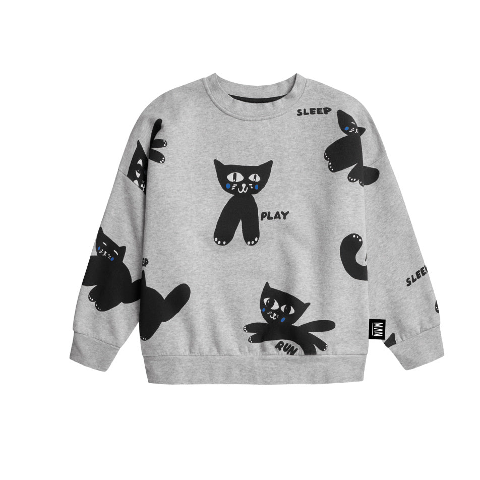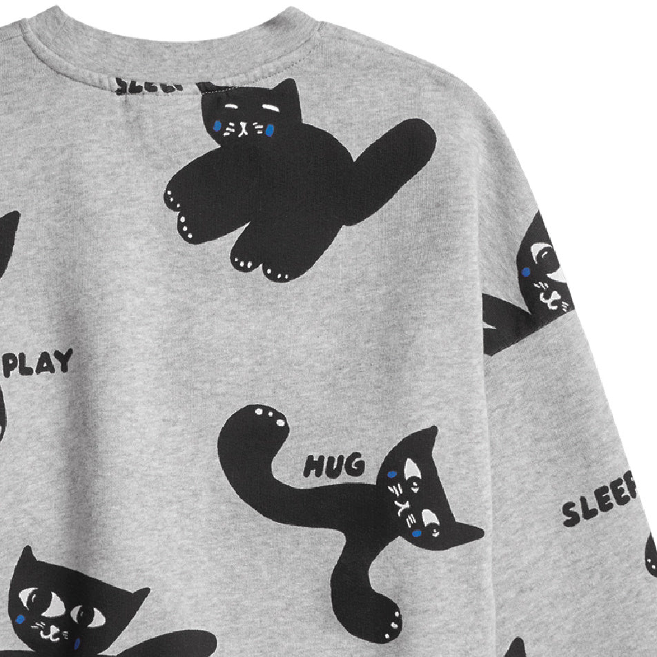 Meow! An oversized and super cool crew neck sweatshirt with an all over black cat print. Designed to express creativity, uniqueness, and the boldness of all ages.