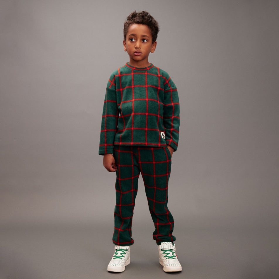 An absolutely soft and cozy, green and red plaid all over long sleeve fleece shirt. Designed for boys and girls alike