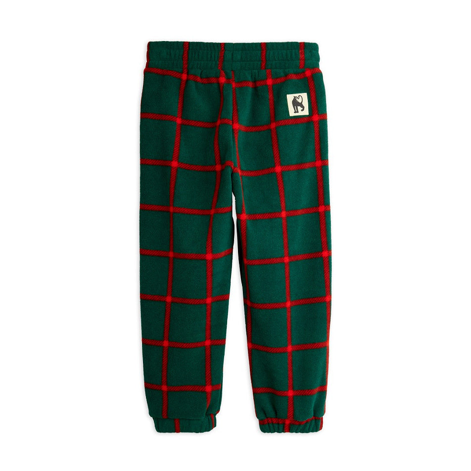 A relaxed fit fleece pant with an all over red and green plaid design, pockets and elastic waistband.