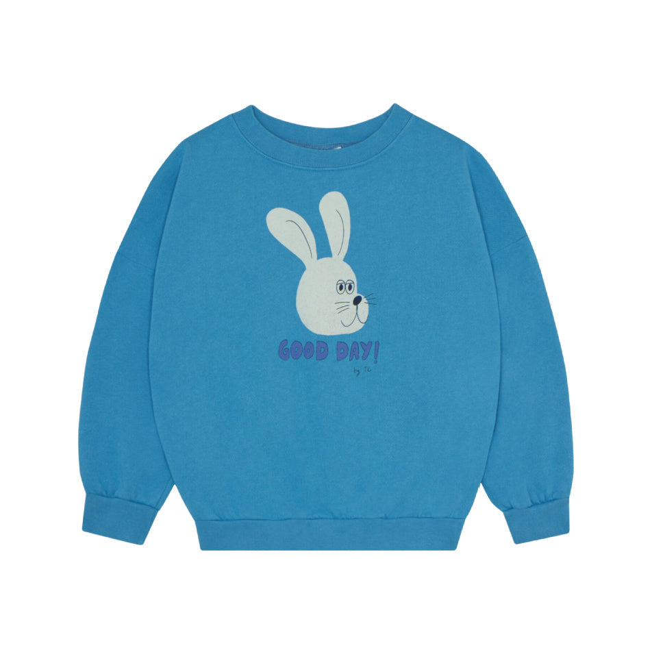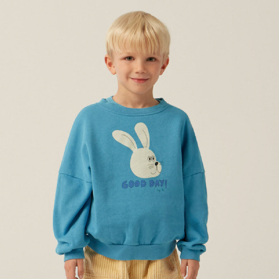 A relaxed fit sweatshirt a cheeky rabbit print on the front, long sleeves on a perfect blue base. We recommend sizing up for a looser fit.
