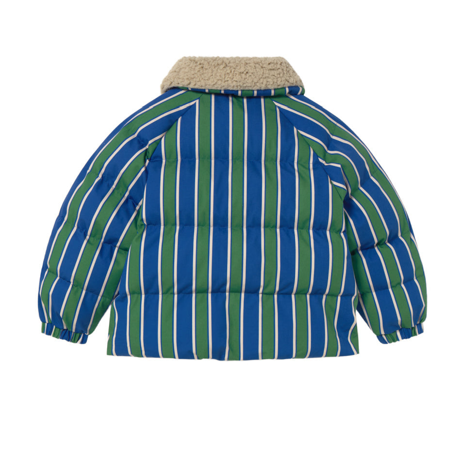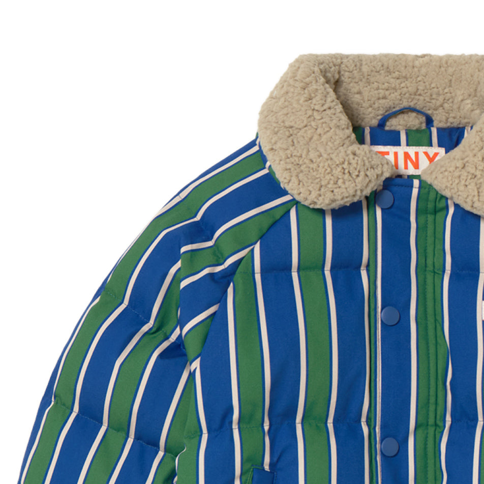 This super warm Retro Stripes padded jacket is made from 100% cotton with an ECO WDR (Durable Water Repellent) finish and a protective coating that offers water resistance of 500-800pa. Designed to keep the kids dry and cozy, it features a sherpa-lined collar with a full zip closure, an additional snap front placket, and sherpa-lined pockets for extra warmth. Perfect for everyday wear, this jacket combines practical style and comfort for cooler days.