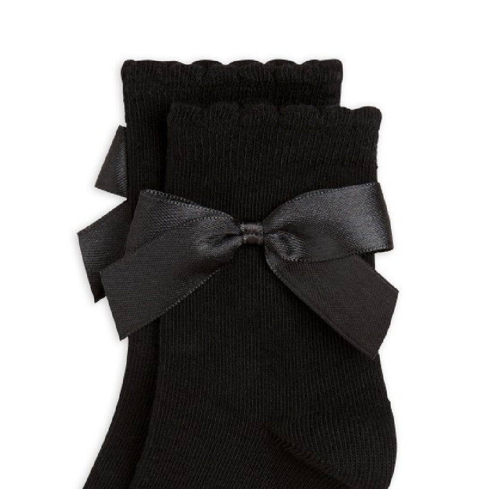 A sweet and chic pair of socks featuring a perfect black satin bow and scalloped edge that is sure to make that outfit's final touch.