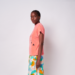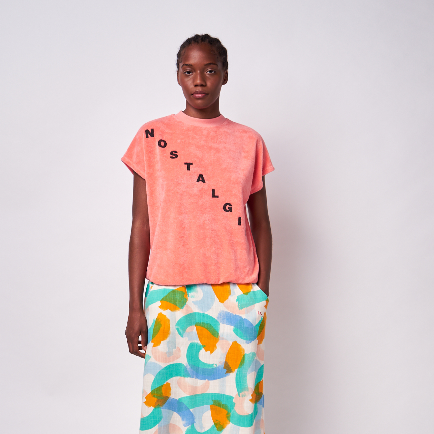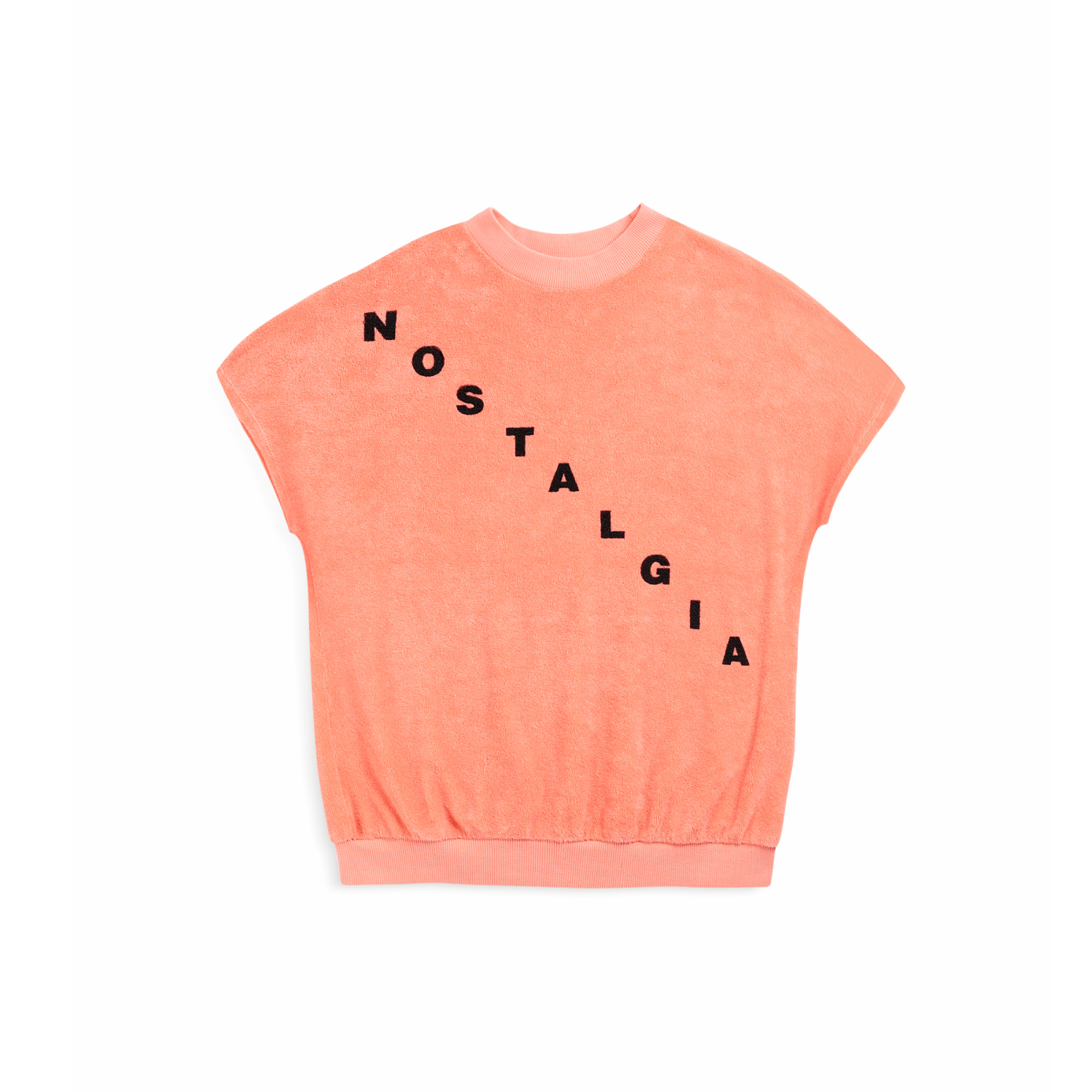 A terry textured loose fitting, cap sleeve shirt featuring a fun "NOSTALGIA" text print on the front side.