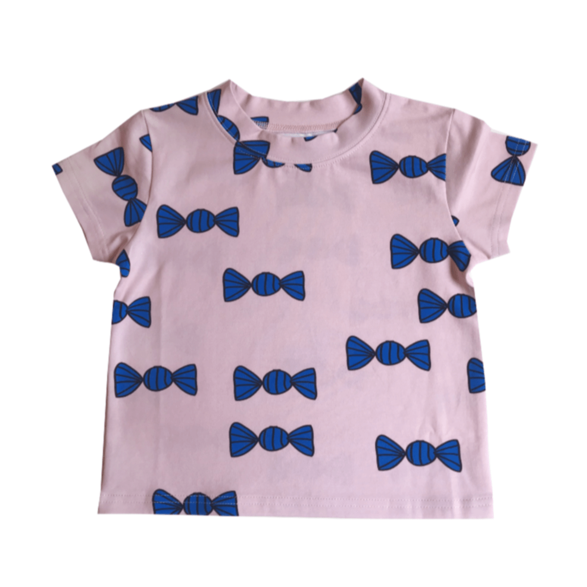 An adorable wide fit short sleeve tee featuring an all over candy print in blue and pink. Perfect for your sweet treat loving little one. Pair with one of our matching shorts for a great set.
