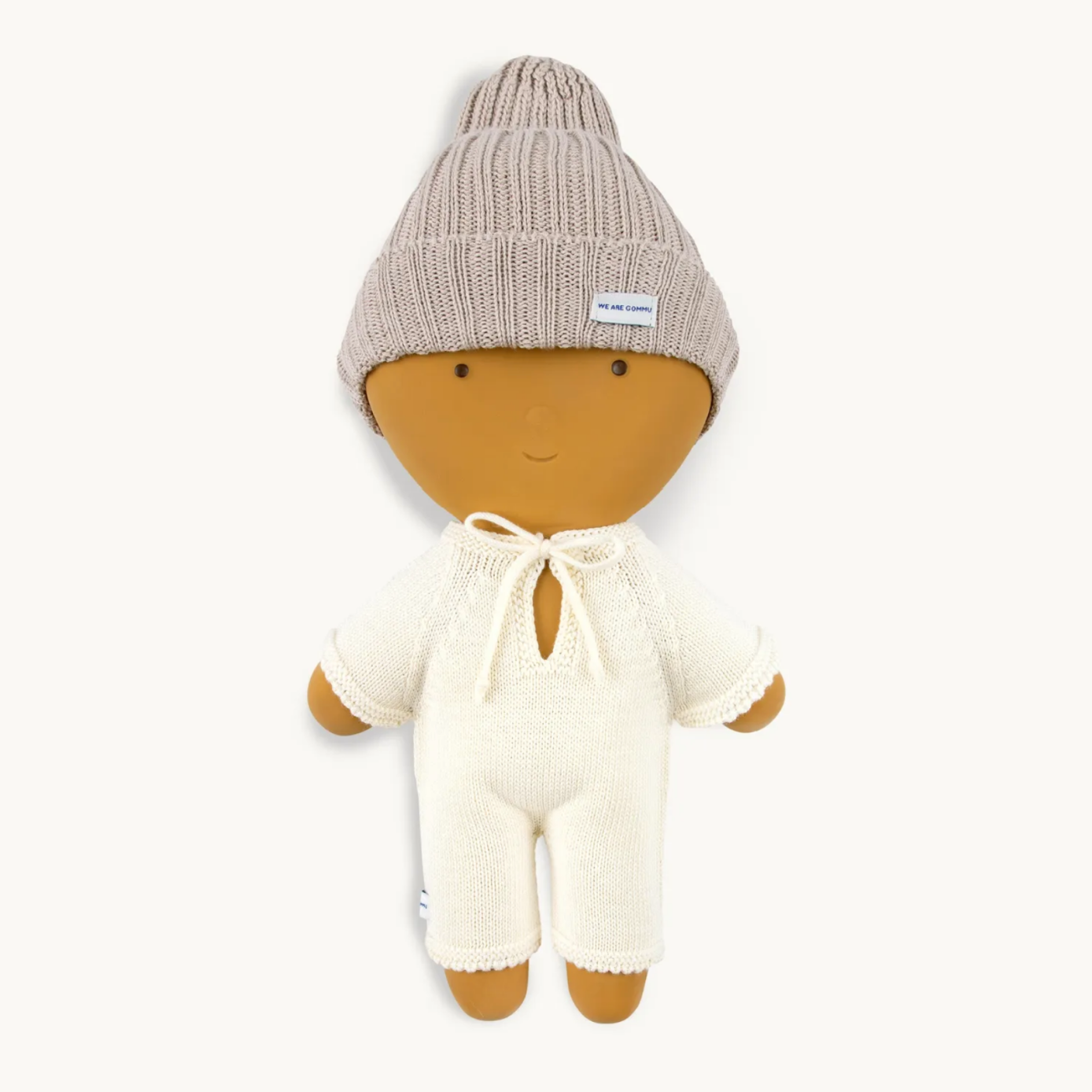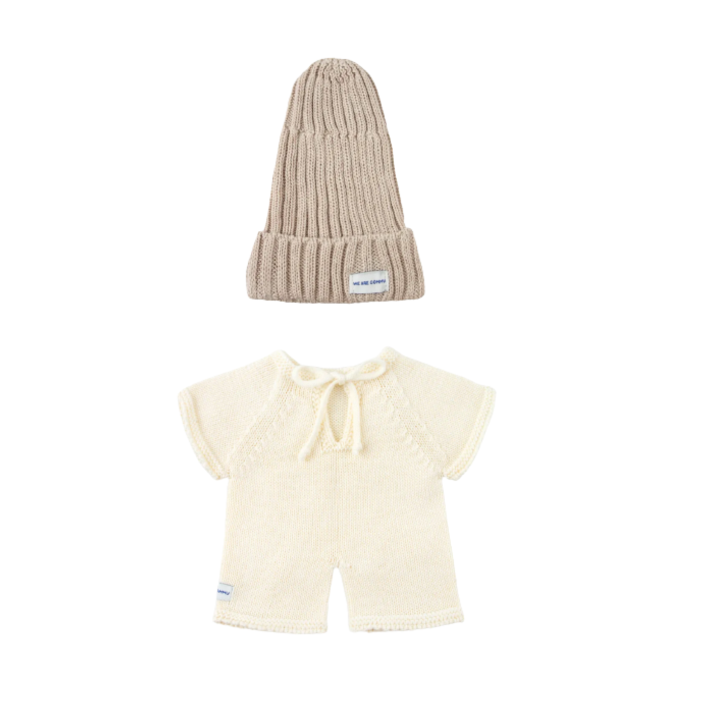 Made of high quality organic cotton italian yarn. The LOOK #3 consists of a beautiful white romper with a front tie and a coordinating knit hat. These pieces encourage to share the moments of play and help to develop the psychomotor skills and patience.