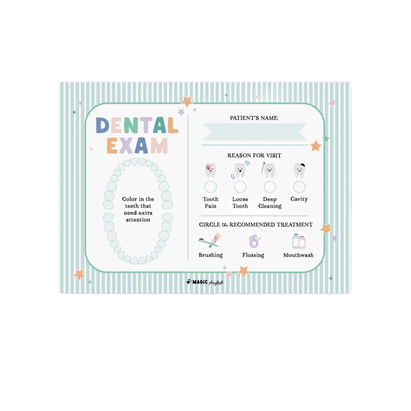 Make your little one's imagination grow with our Dentist pretend play notepad! Use with stuffed animals or dolls to set up a pretend dentist visit and play over and over again.
