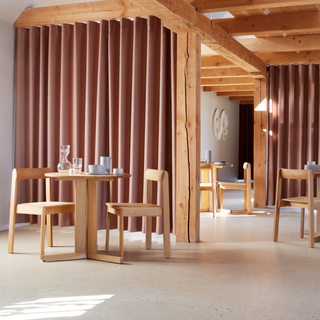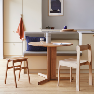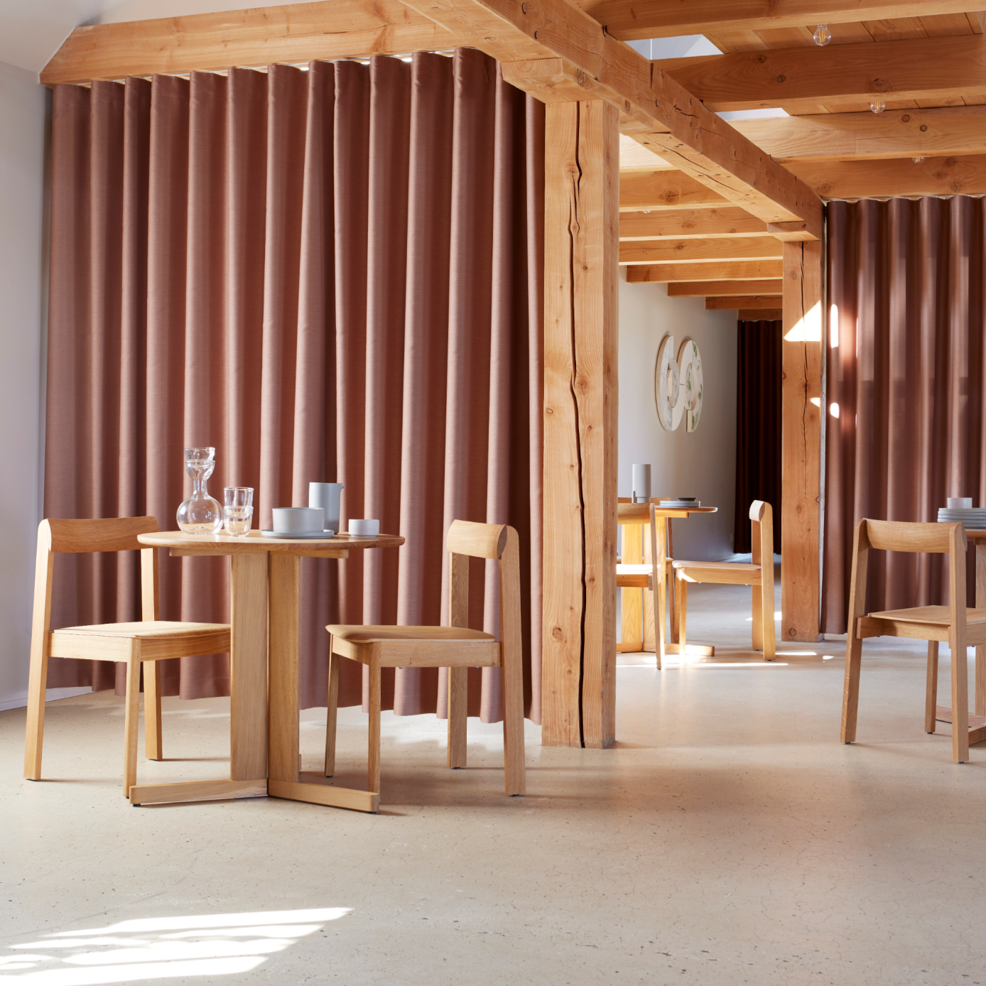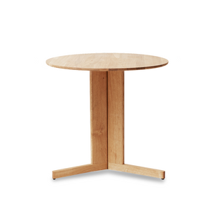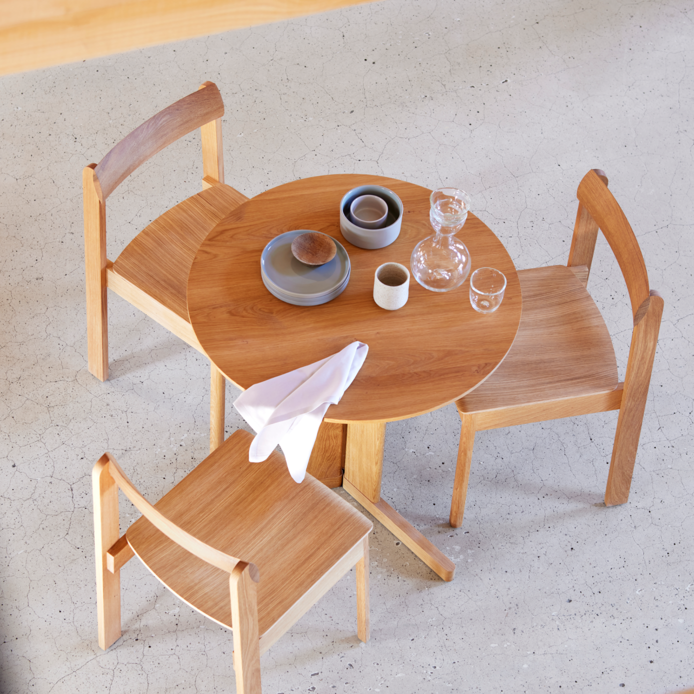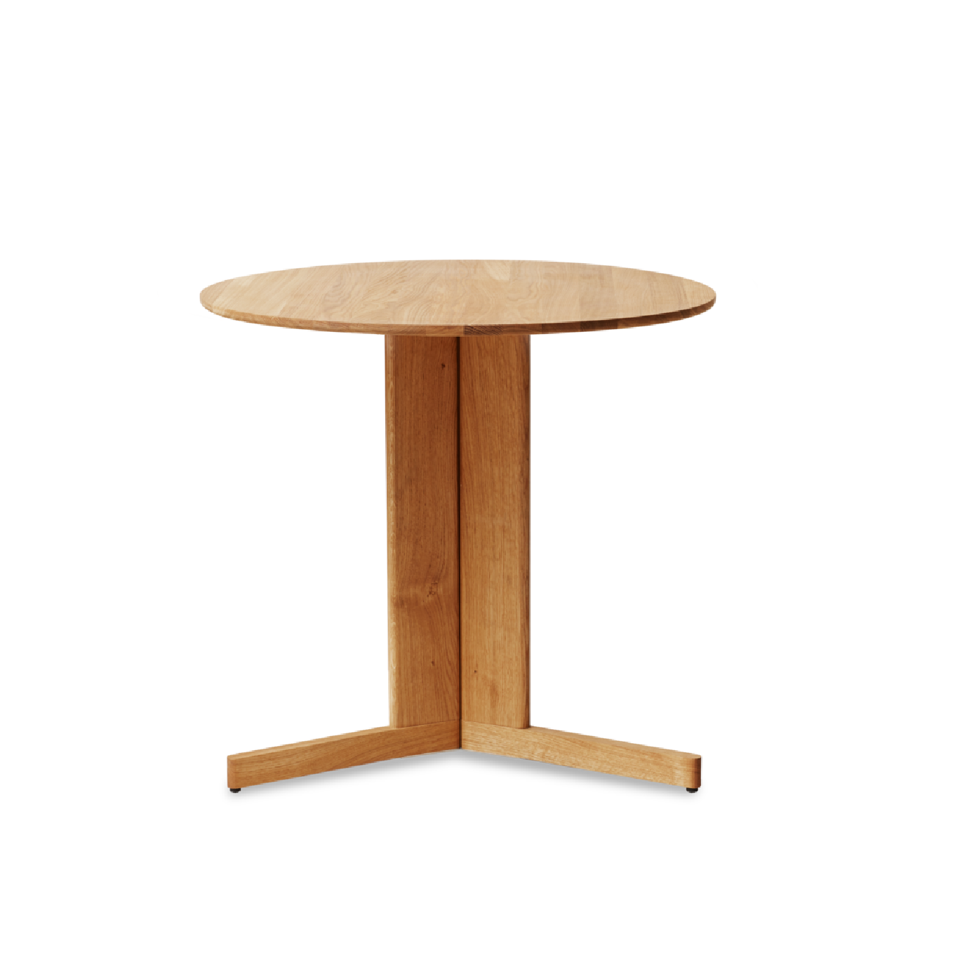 A center point of free-floating solid oak elements holds the round table and creates a contradiction of lightness and a substantially dense round table. The free space of the three legs adds to the lightness and special visual complexity of the table. The three legs make it possible to sit around the table without anyone getting into a conflict with their legs. The table is made to fit all desires – kitchens, hospitality, office..