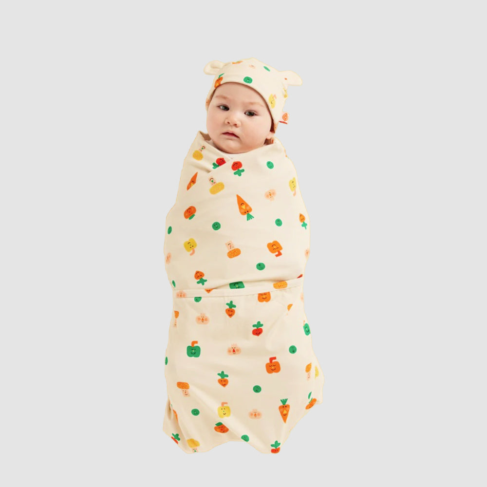 Snuggle them up in this adorable cotton blanket featuring soft rounded corners and the most adorable happy little garden crop print. Meet baby carrots, tiny radishes, and the cheekiest peas in the patch, because the sweetest things start small and grow with love. This deliciously sweet print is in collaboration with artist with Julie Rambaud.