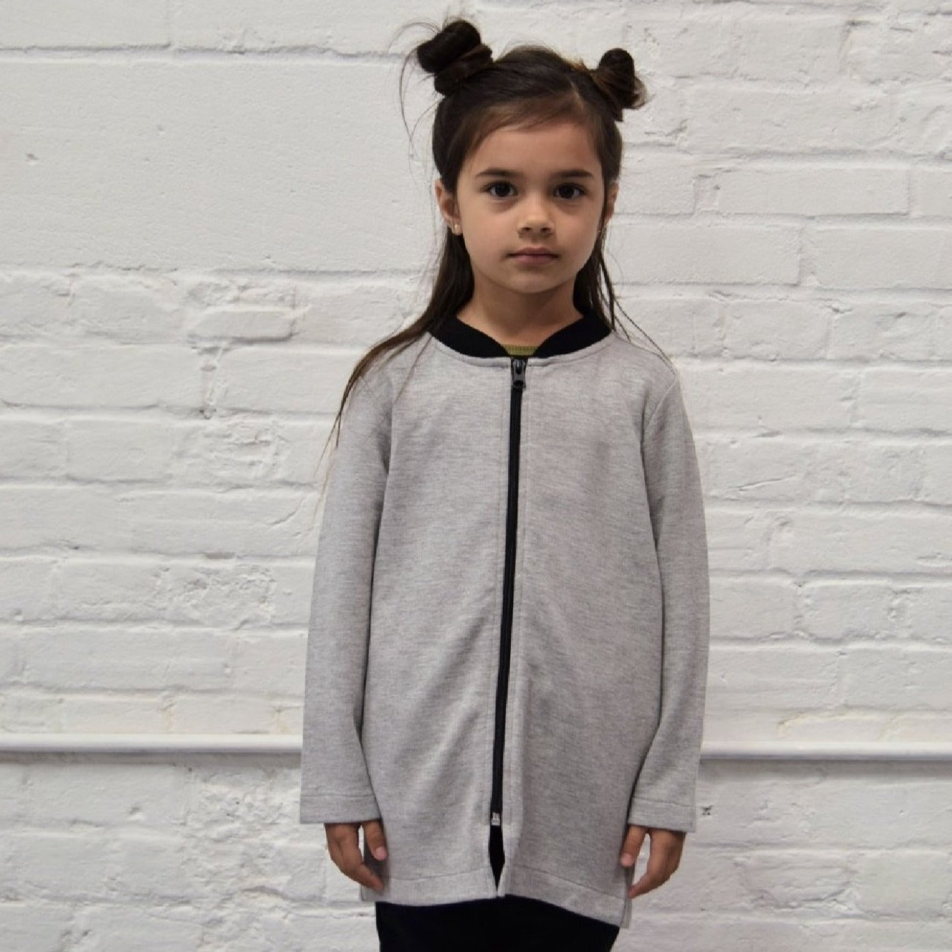 A perfect and cozy long line jacket featuring a grey base and black collar, side hem pockets and zip front.
