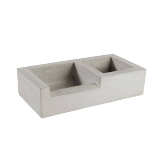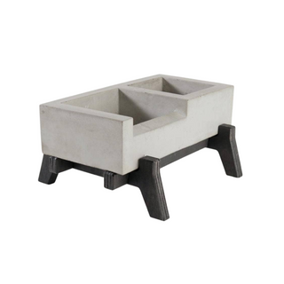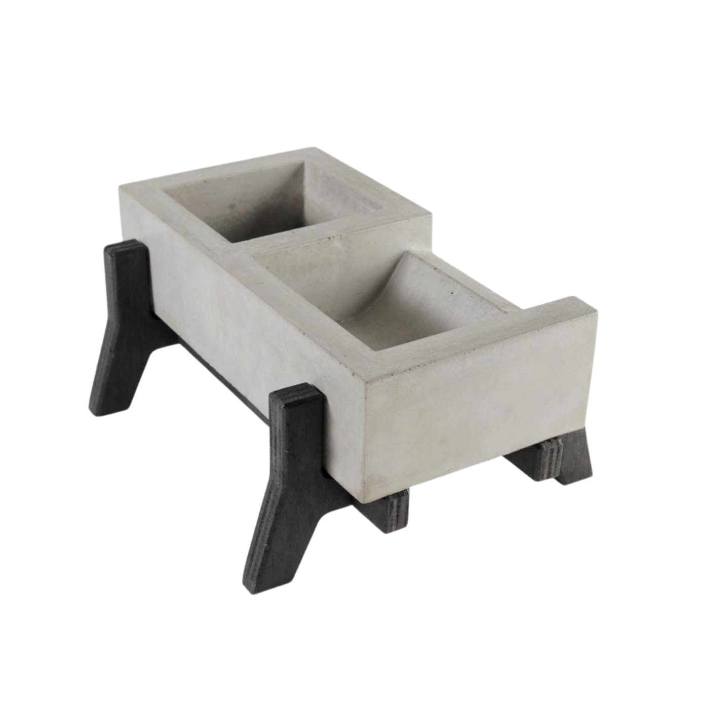 For the modern pet and their design loving human. A sleek concrete bowl featuring two openings. One side has an angled design making it great for both small and large animals. Works with both water, pet foods. This minimalist piece can hold up to 20 ounces and includes a removable Black Wooden Base.