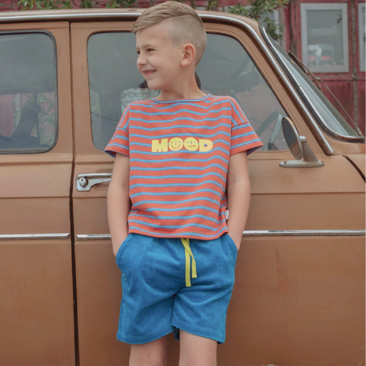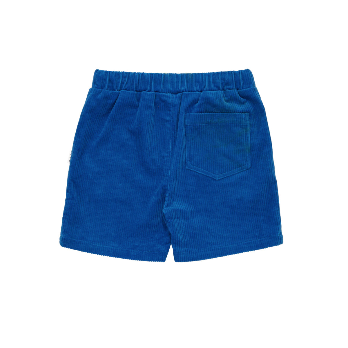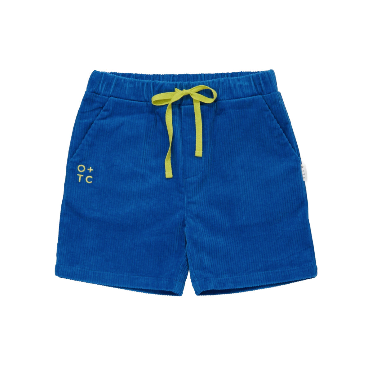 Cool, classic, casual. Made with a soft cord, plus two side pockets and one back pocket for collecting treasures. Super soft bright blue wide corduroy, a contrast lime green drawcord, and a mid length.