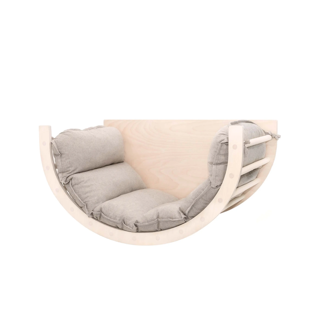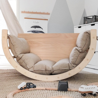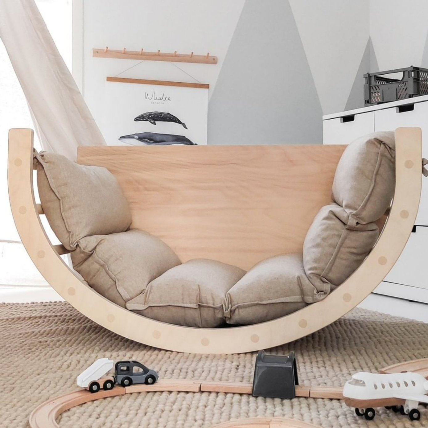 It can be used as a rocker, play fort, baby gym, goal, kids’ table, toy storage or as a side table and includes the beautiful custom made cushion for softer and more comfortable rocking.