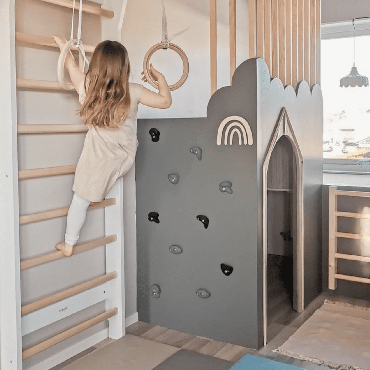 This gorgeous climbing wall bar set is a multi-functional Scandinavian piece of kids’ furniture. Kids love hanging, swinging, and learning new tricks with them... let that energy out!