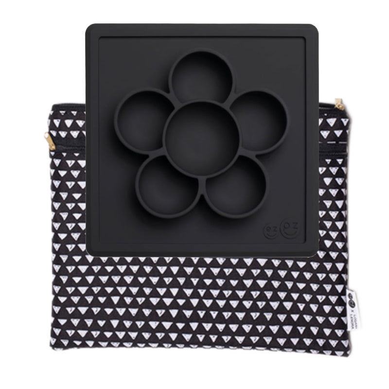 The Flower Mat is an all-in-one placemat + plate that captures your kid's mess. It suctions directly to the table, making it nearly impossible for tiny hands to tip over. The Travel Bundle features a suction Mat and a Logan + Lenora Portfolio Bag in a triangle monochrome print.
