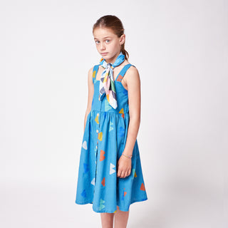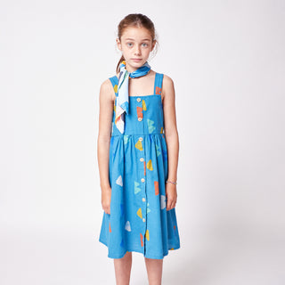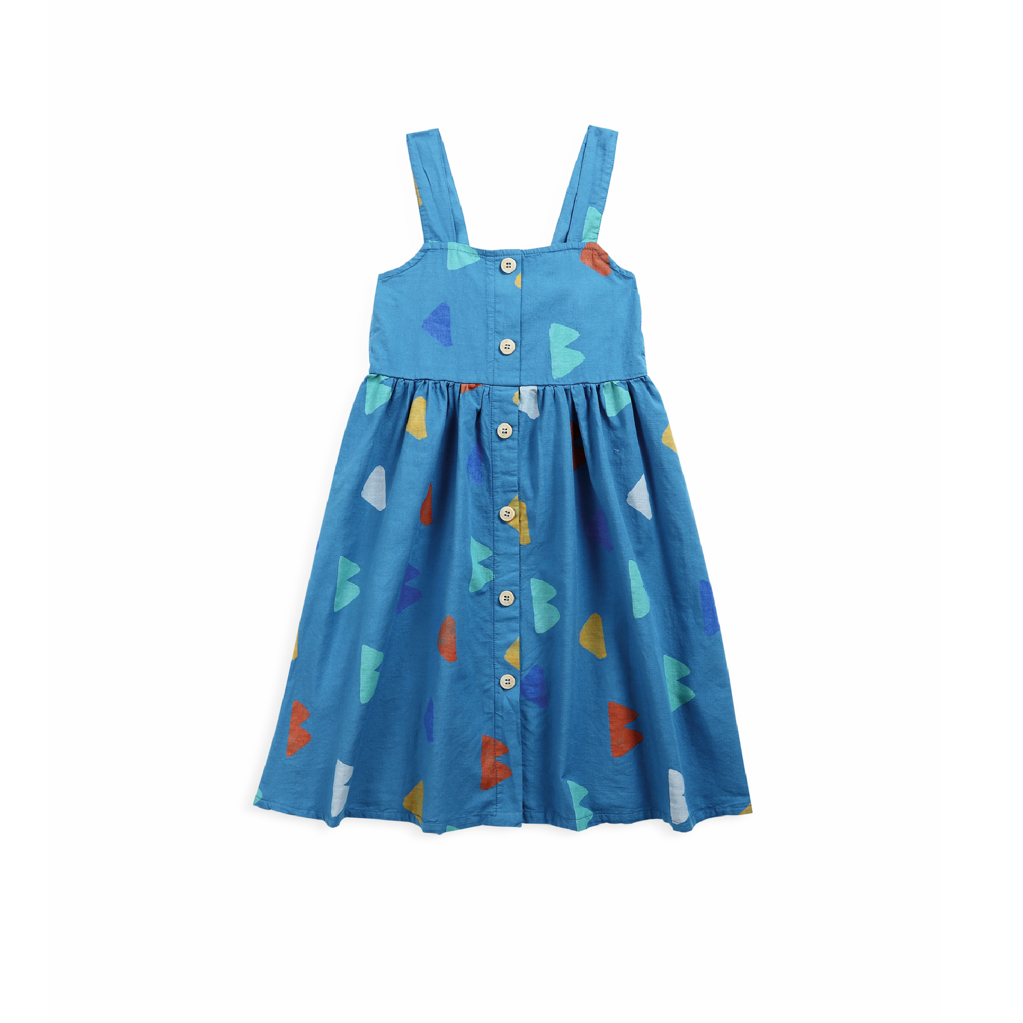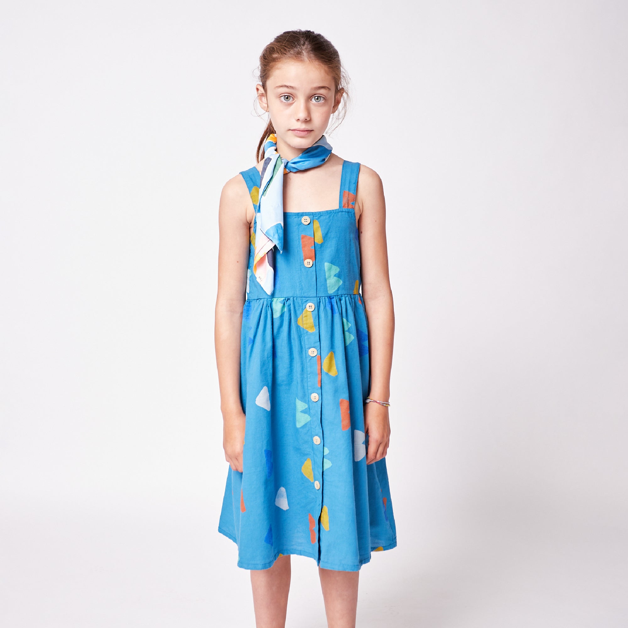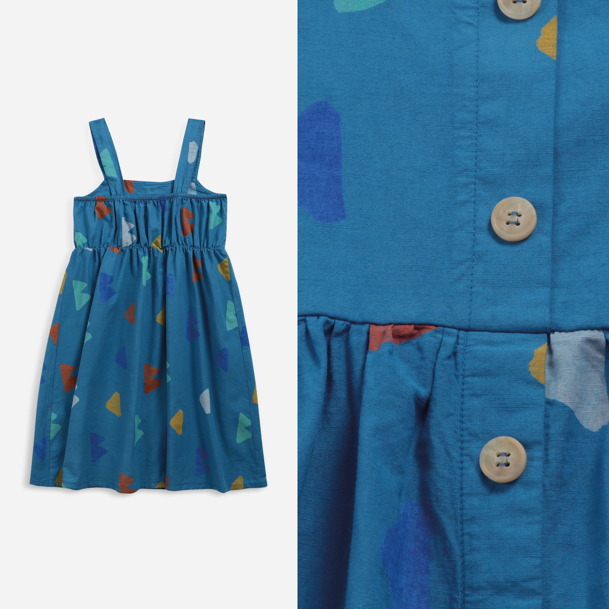 A beautiful strap dress with a button front, blue base and all over colorful B.C. print. How do you rock your Bobo?