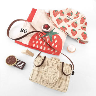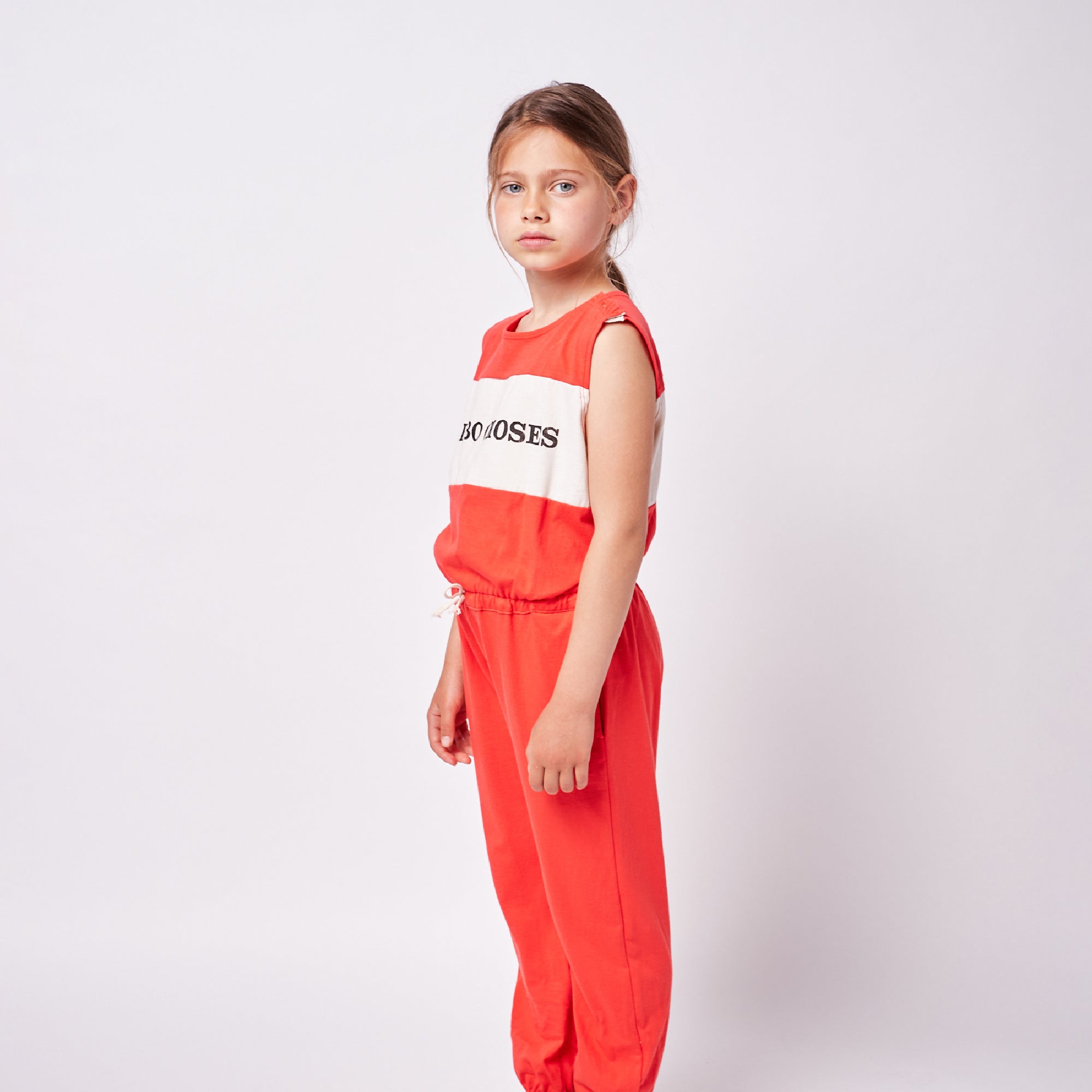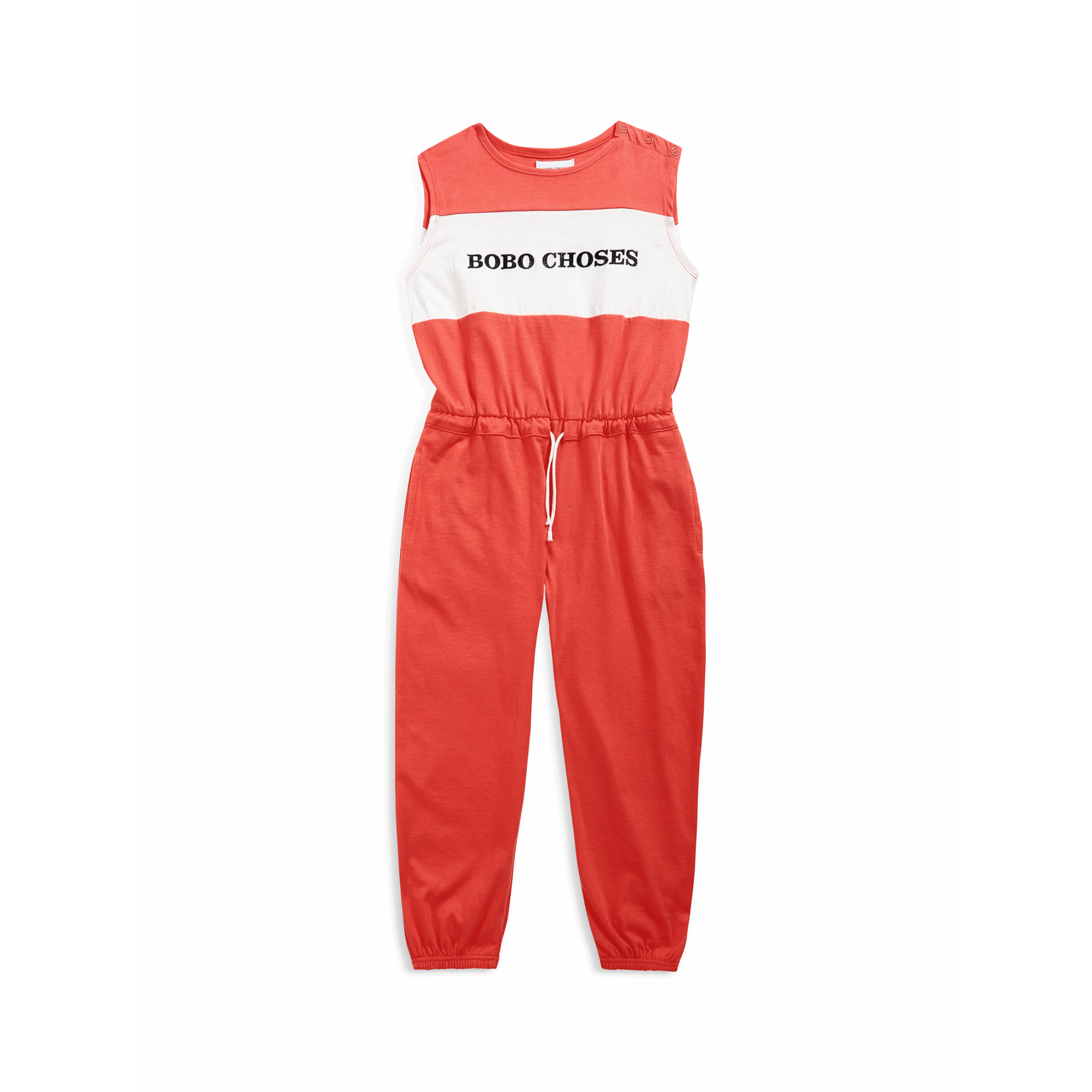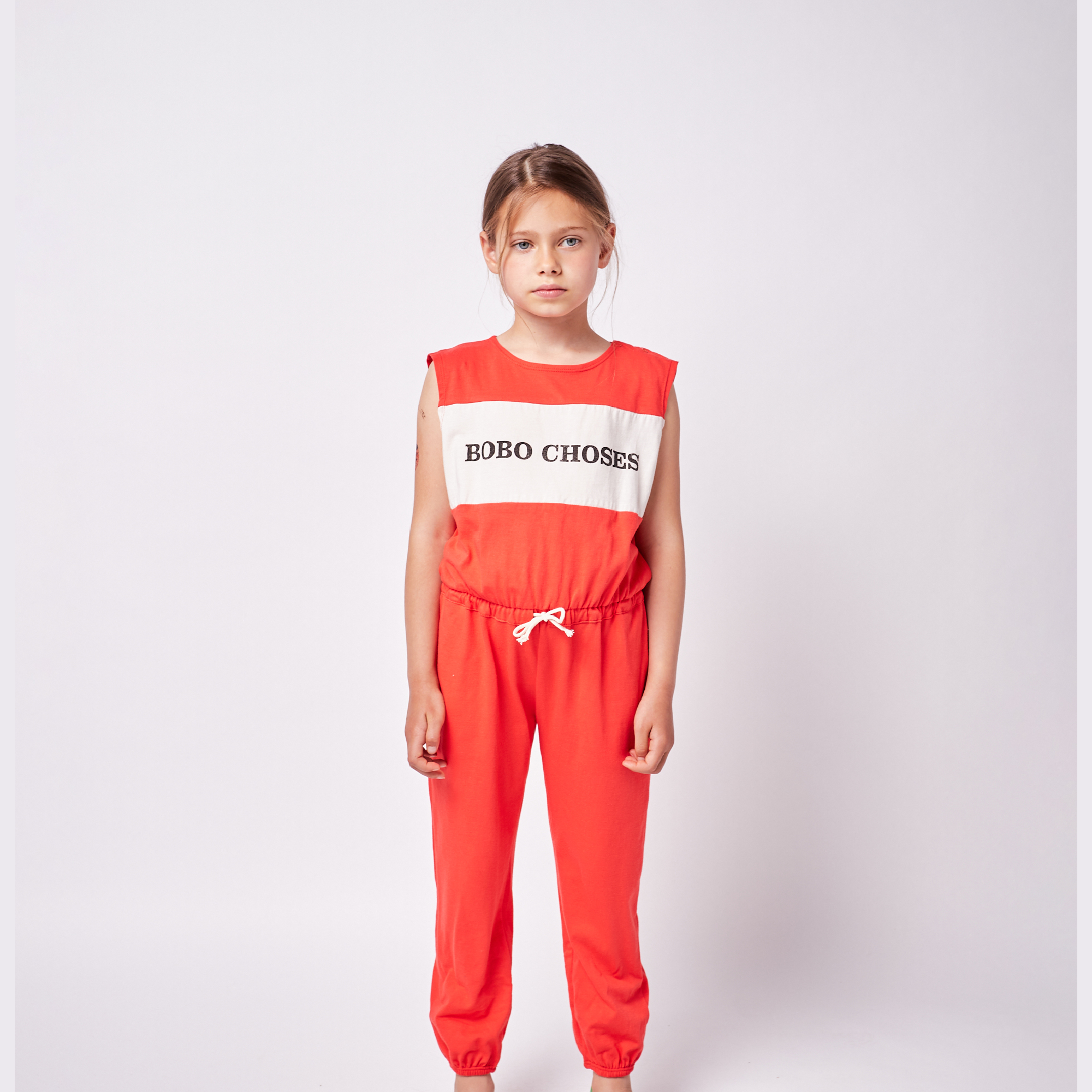A beautiful sleeveless sleeve romper featuring a cinched tie waist, shoulder buttons, a back pocket, and the "BOBO CHOSES" logo on the front. How do you rock your Bobo?