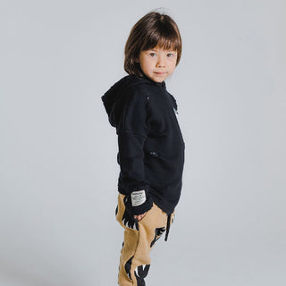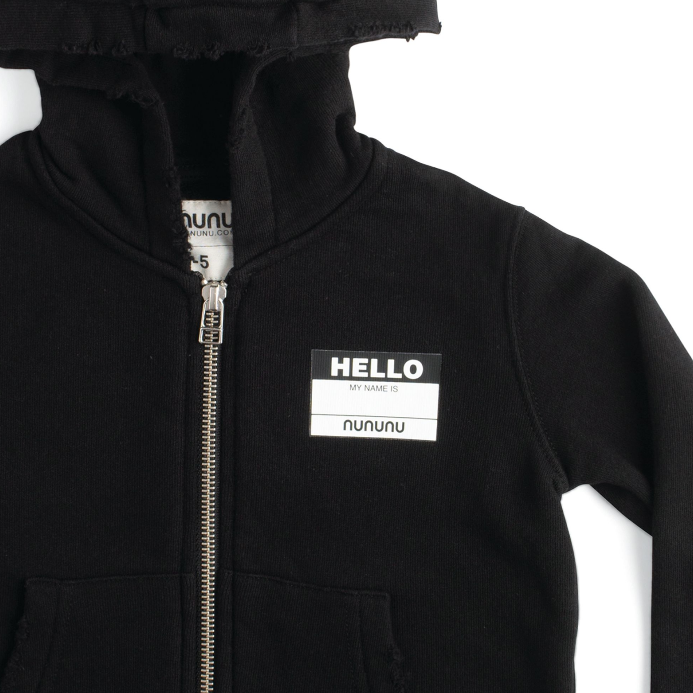 This unisex black hoodie has artfully placed holes all over, like you’ve just had the roughest day imaginable. If that’s the case, no problem, you’ve got a nice big cozy cotton-lined hood to pull up & signal to the world that you may not be open to interaction at this time. The name tag patch at the chest says hello, even if you’re not feeling too friendly.