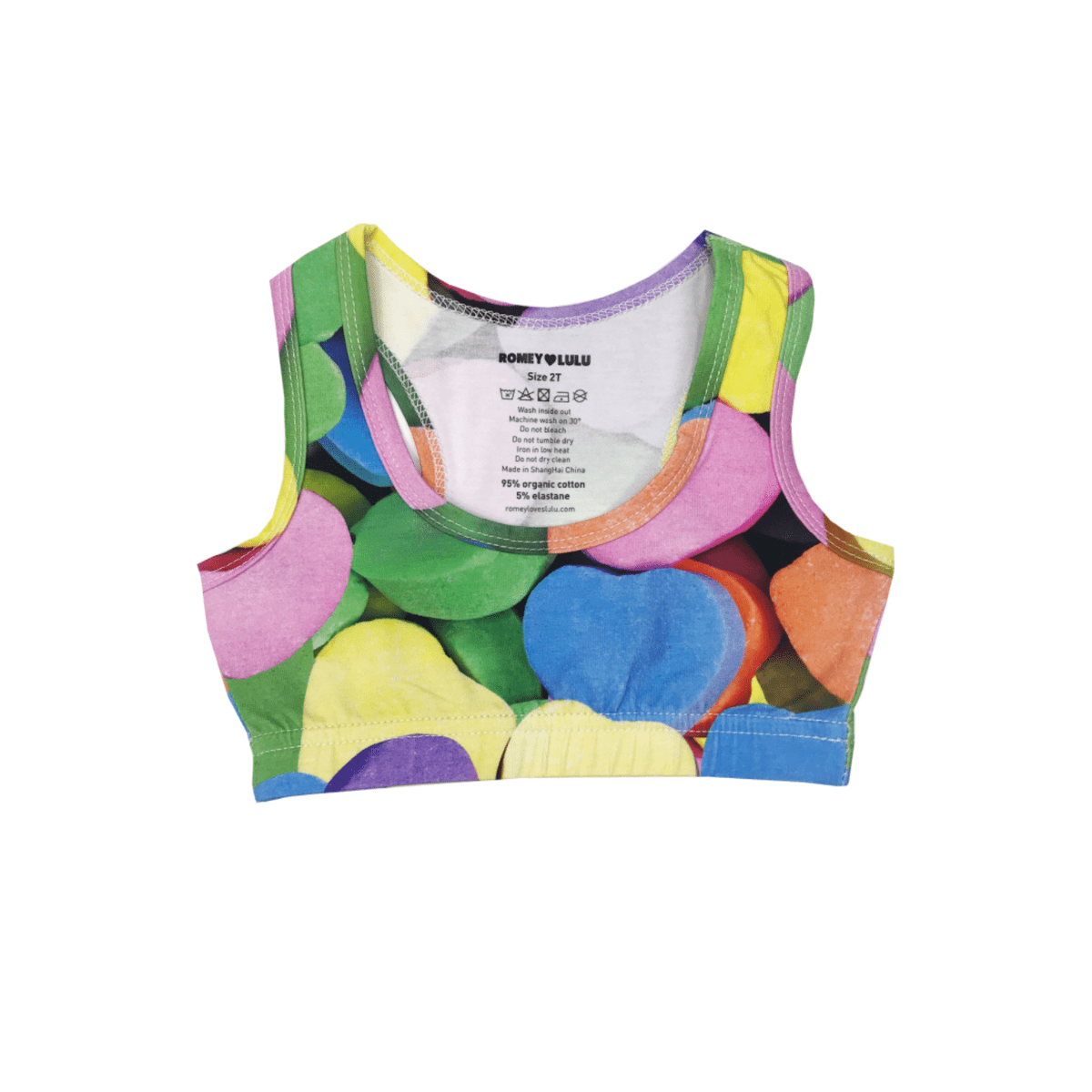 A rad all over candy hearts print on an ultra chic sports style top featuring a candy heart print.