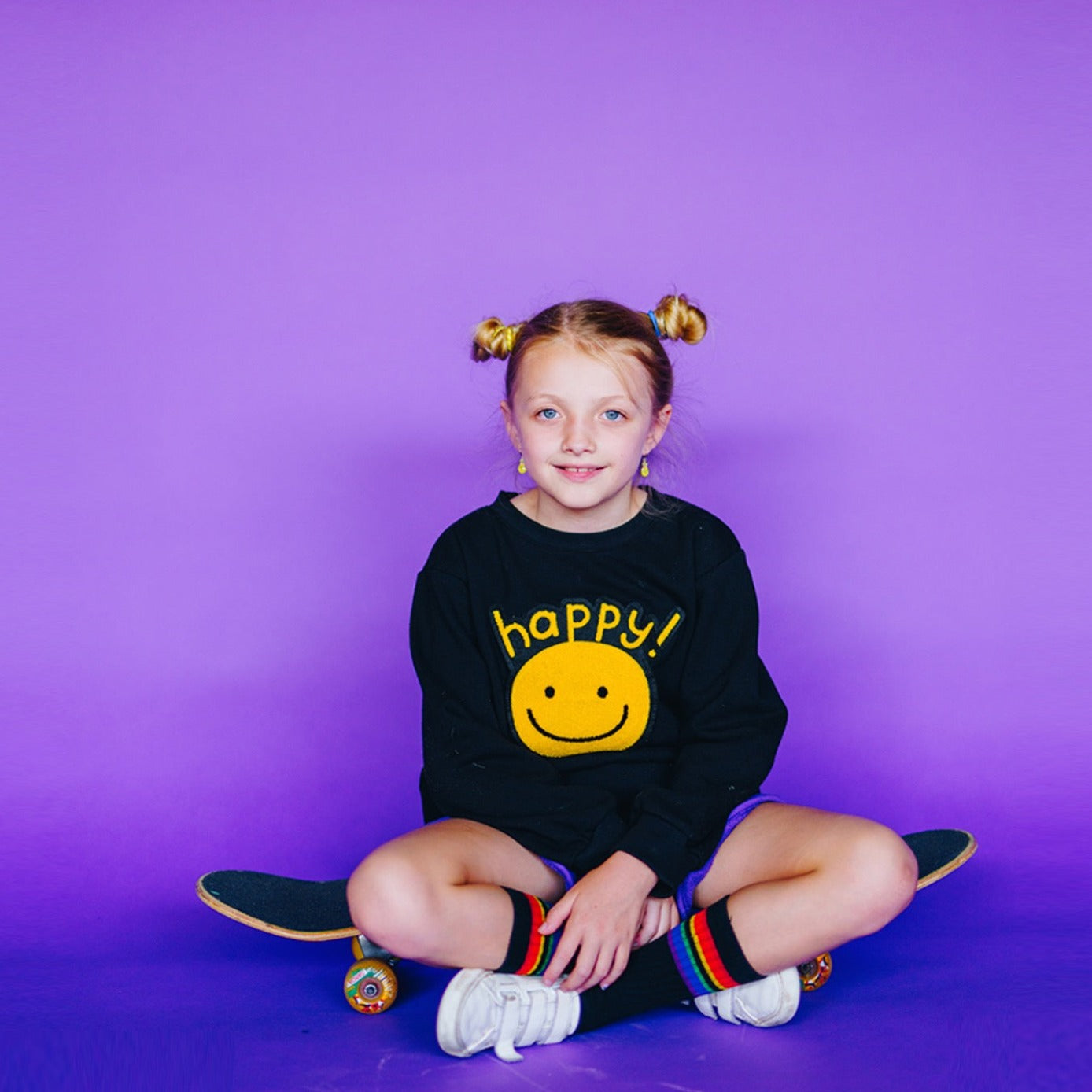This rad cotton sweatshirt features a bold Happy Smiley Face patch.