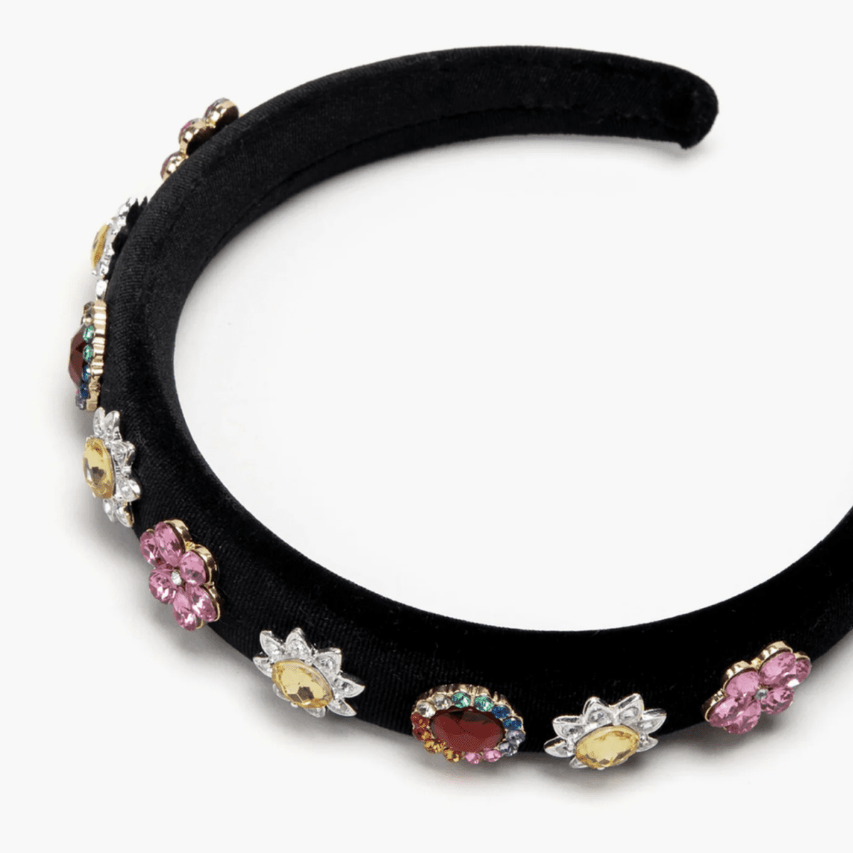 Snag your front row seat (or front yard porch chair!) and smile in style! This extra padded, black velvet headband is as comfy as it is stylish. Oversized floral gemstones in vibrant colors give a high-fashion pop to any outfit. Perfect for people-watching, trend-spotting, and catching the eye of all the street-style photogs.