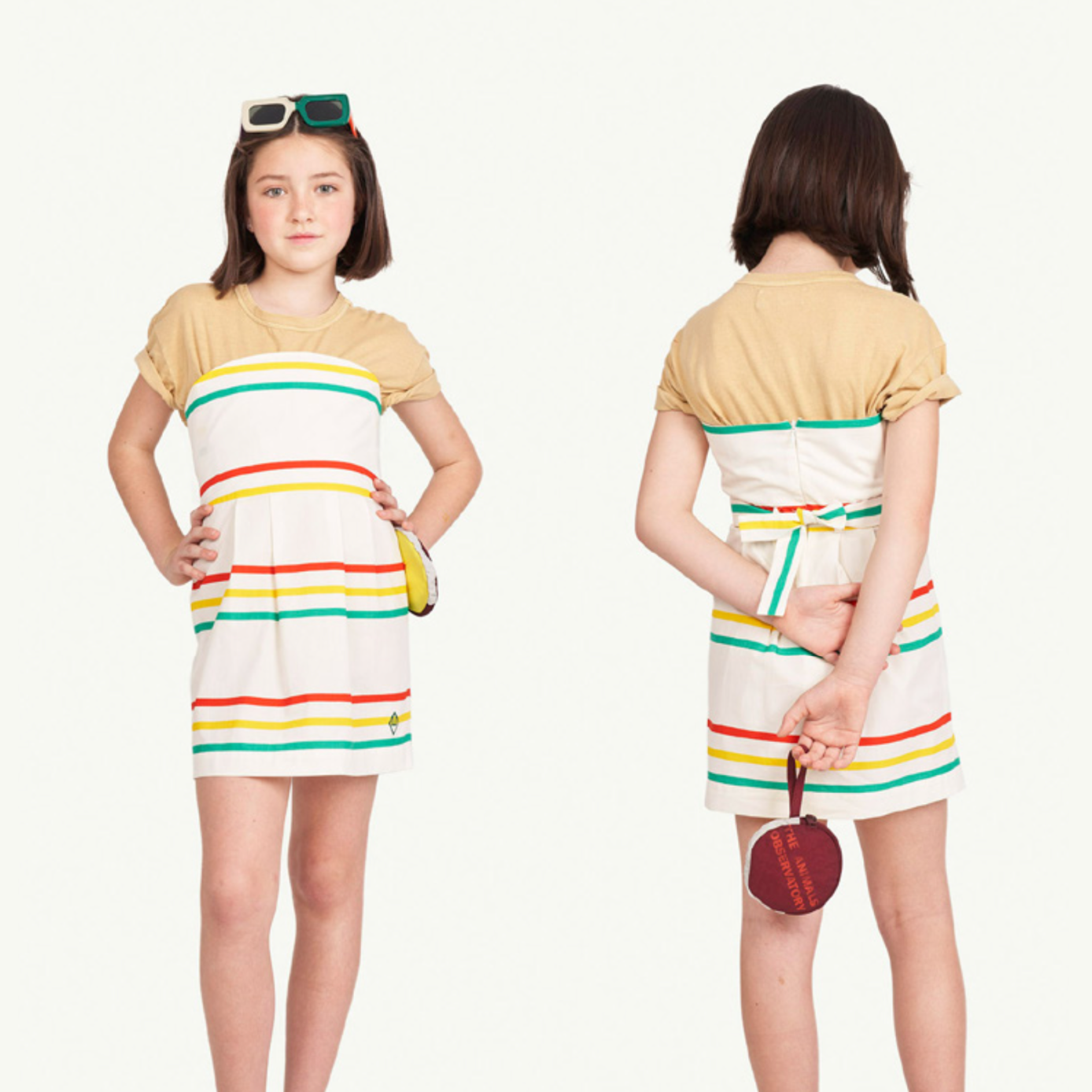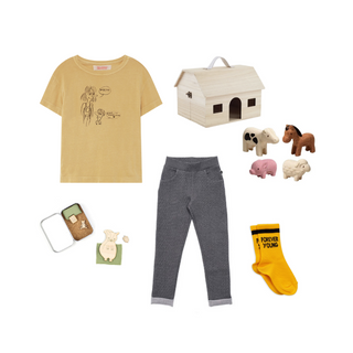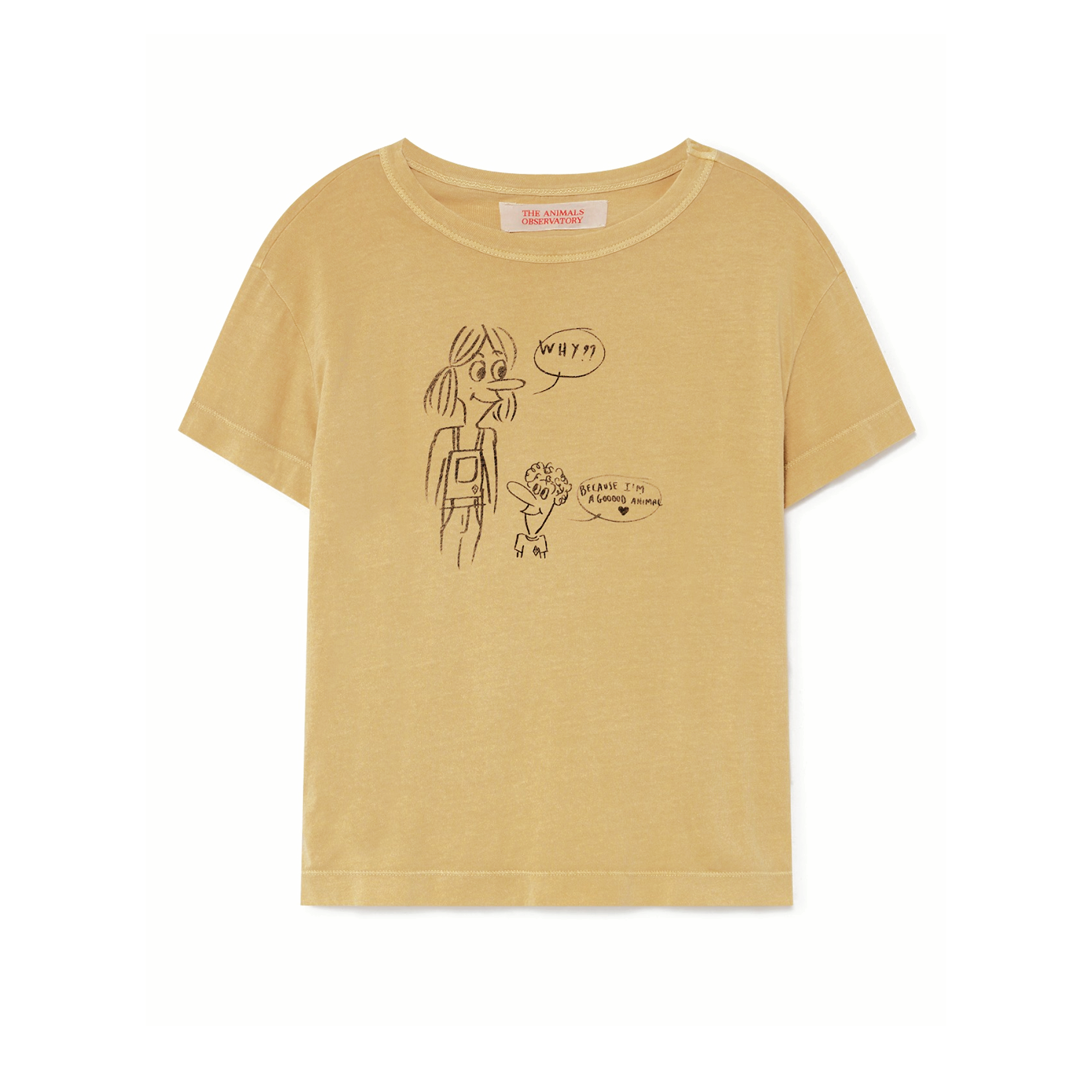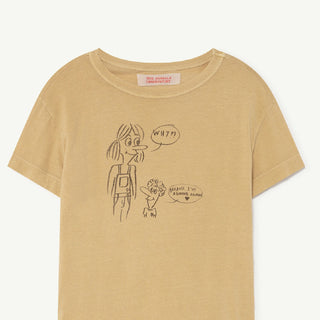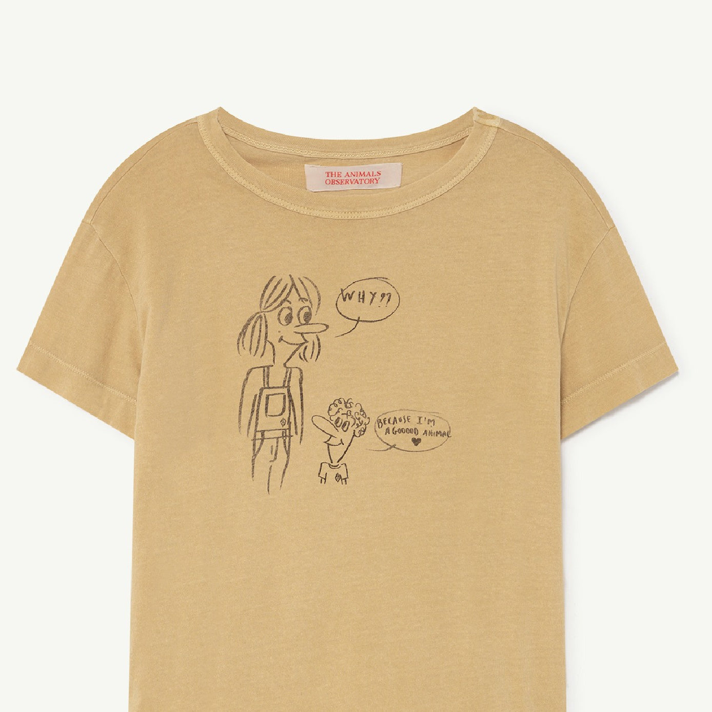 An ultra soft short sleeve tee shirt featuring a light brown base and a playful print on the front.