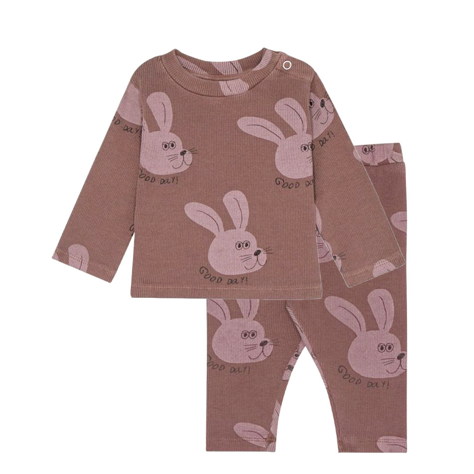 This ribbed pant is soft and stretchy, featuring an all over adorable bunny rabbit wishing you and your little a very good day!