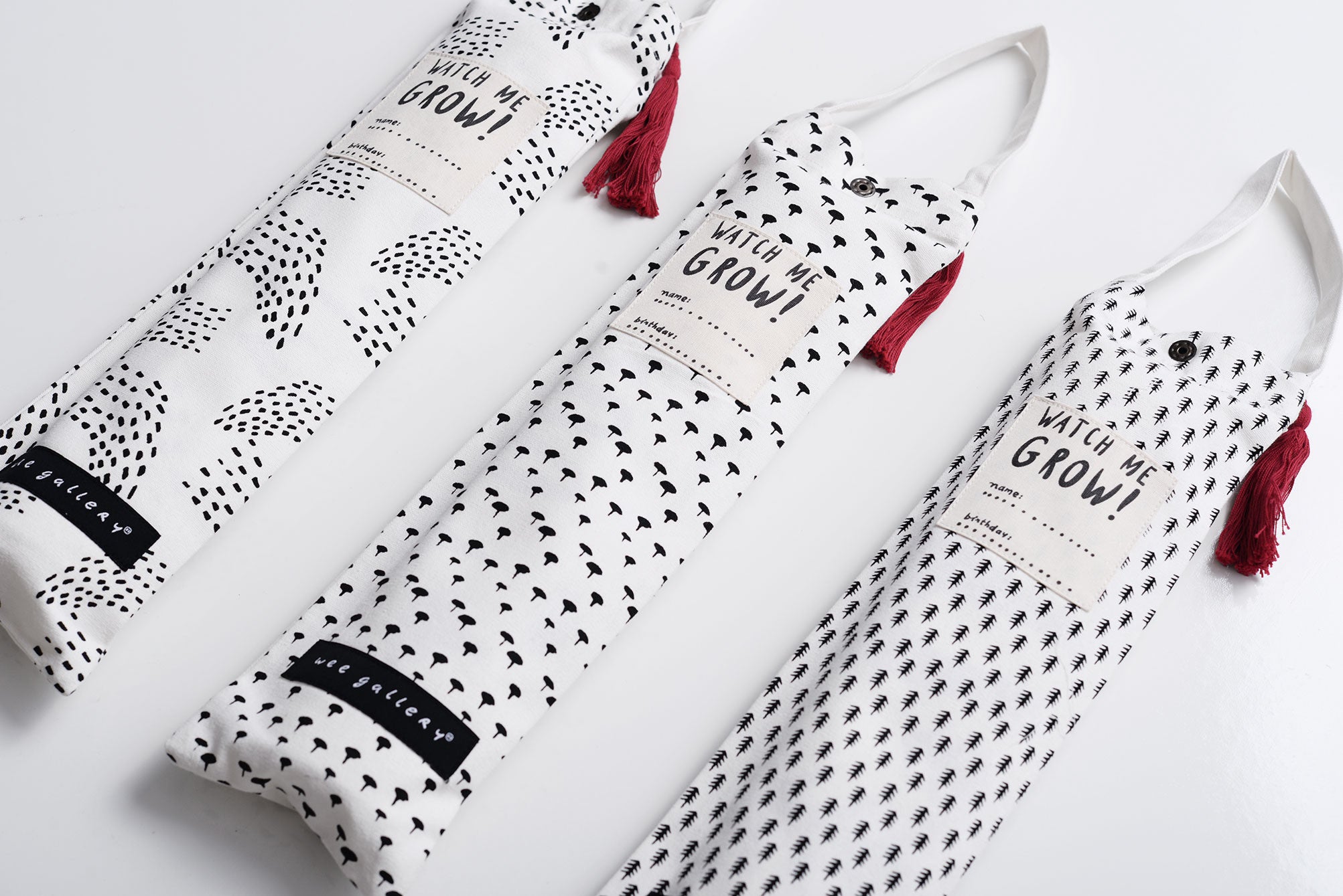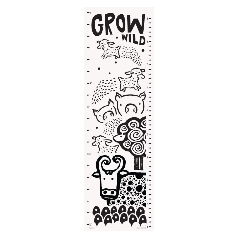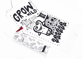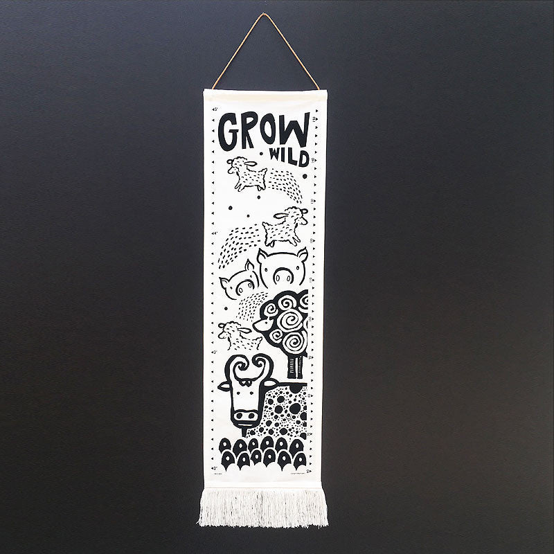This growth chart features sweet animal faces that smile as your little one grows. Ethically and sustainably made in India using screen printing on organic cotton canvas, finished with a leather hanging cord and stylish fringe end.  Comes in a special keepsake bag with a place for your child's name and birth date.