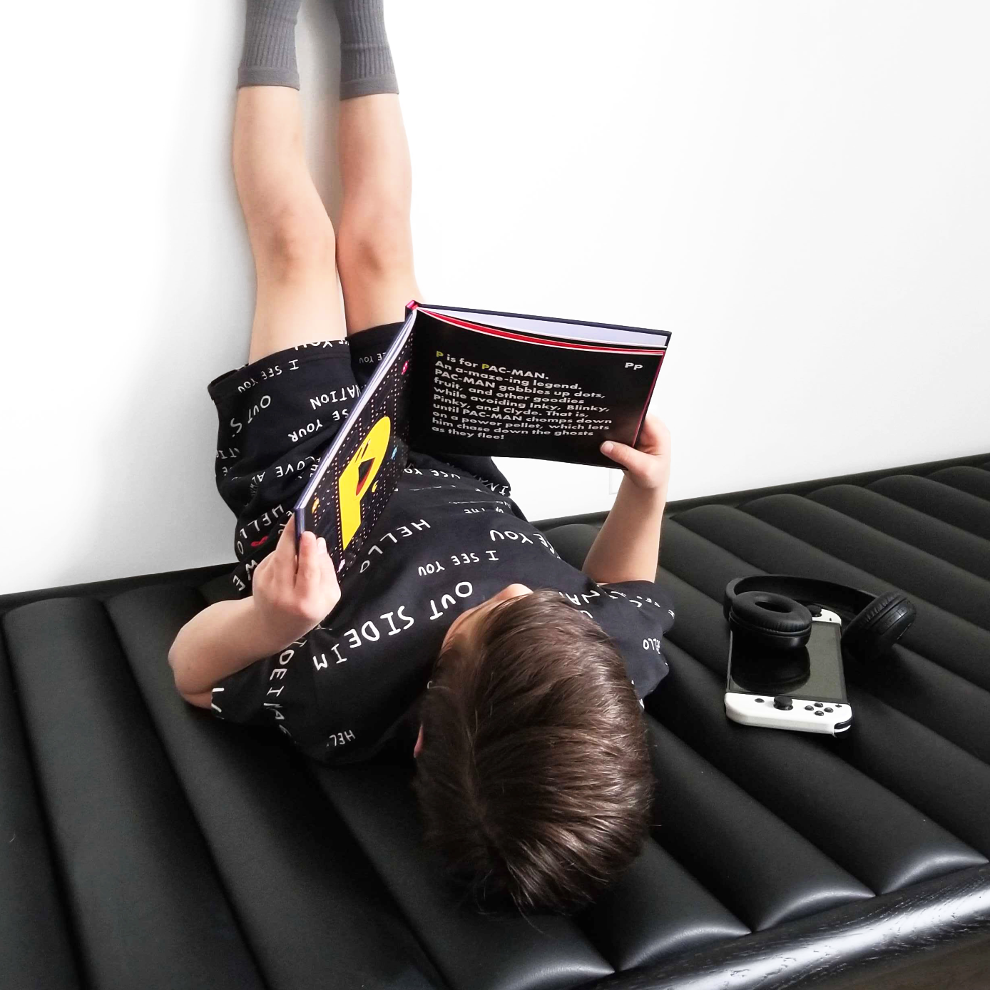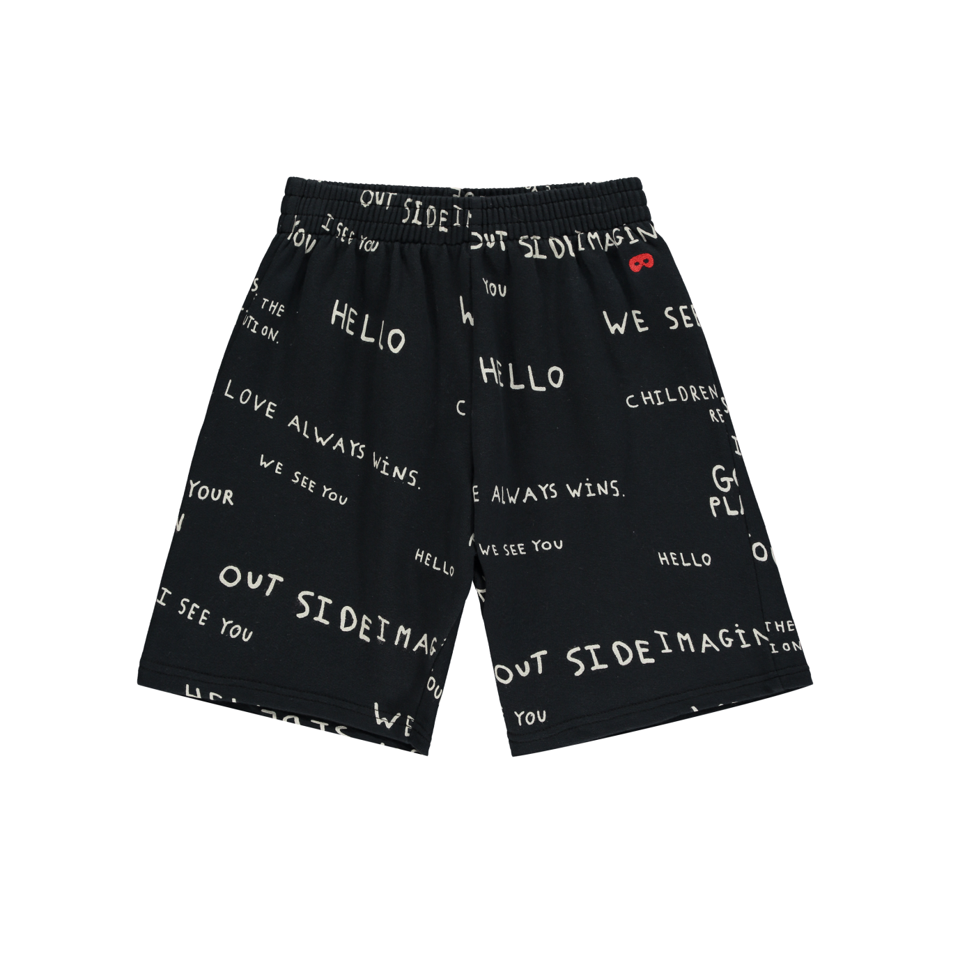 A soft and playful sweat short with an all over text featuring journal entries from the imaginations of kids on a black base, with an elastic waistband and back pocket. Rock with the matching tee shirt for the perfect set!