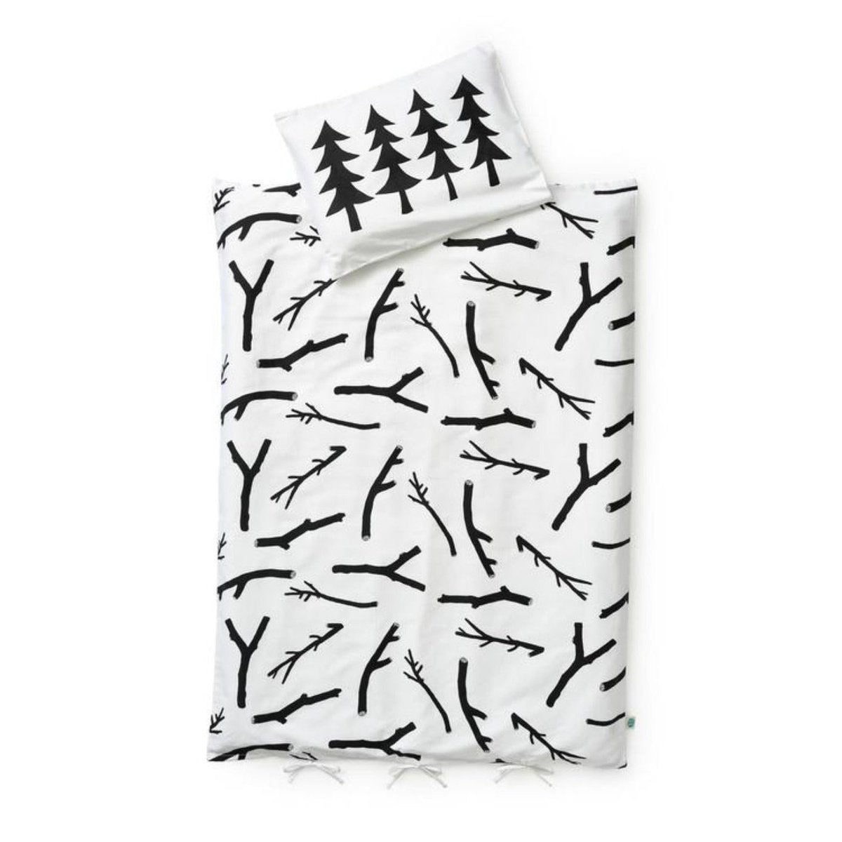 The Twigs Duvet Set, inspired by nature. There is a kid in all of us that just loves collecting twigs and branches! Cozy up with a soft and cuddly pile of sticks. This black and white print looks awesome in any little ones room! One side is hand screen-printed and the reverse is white.