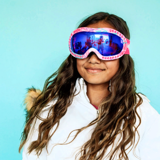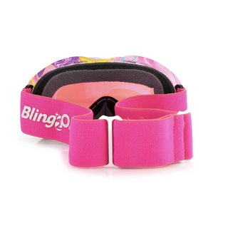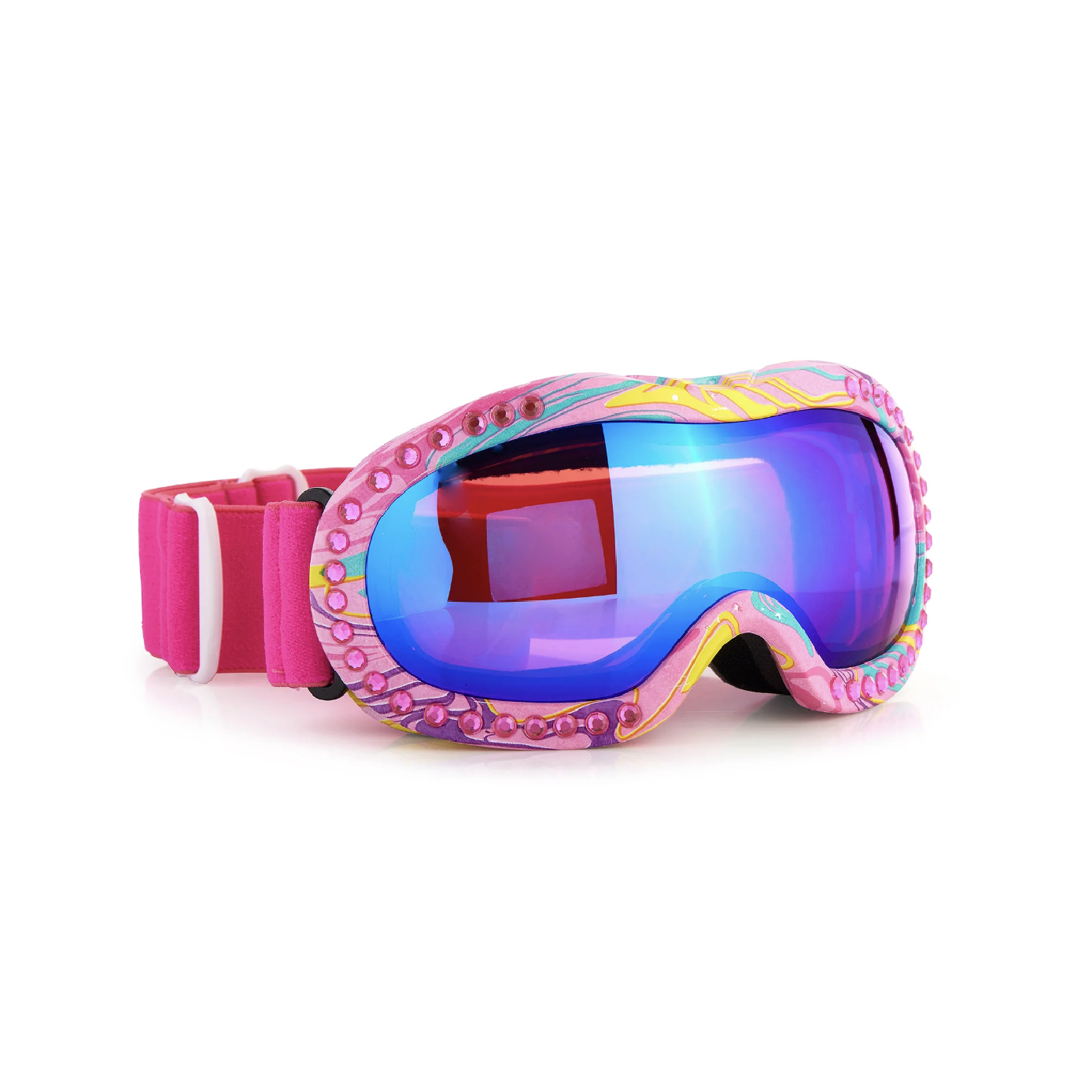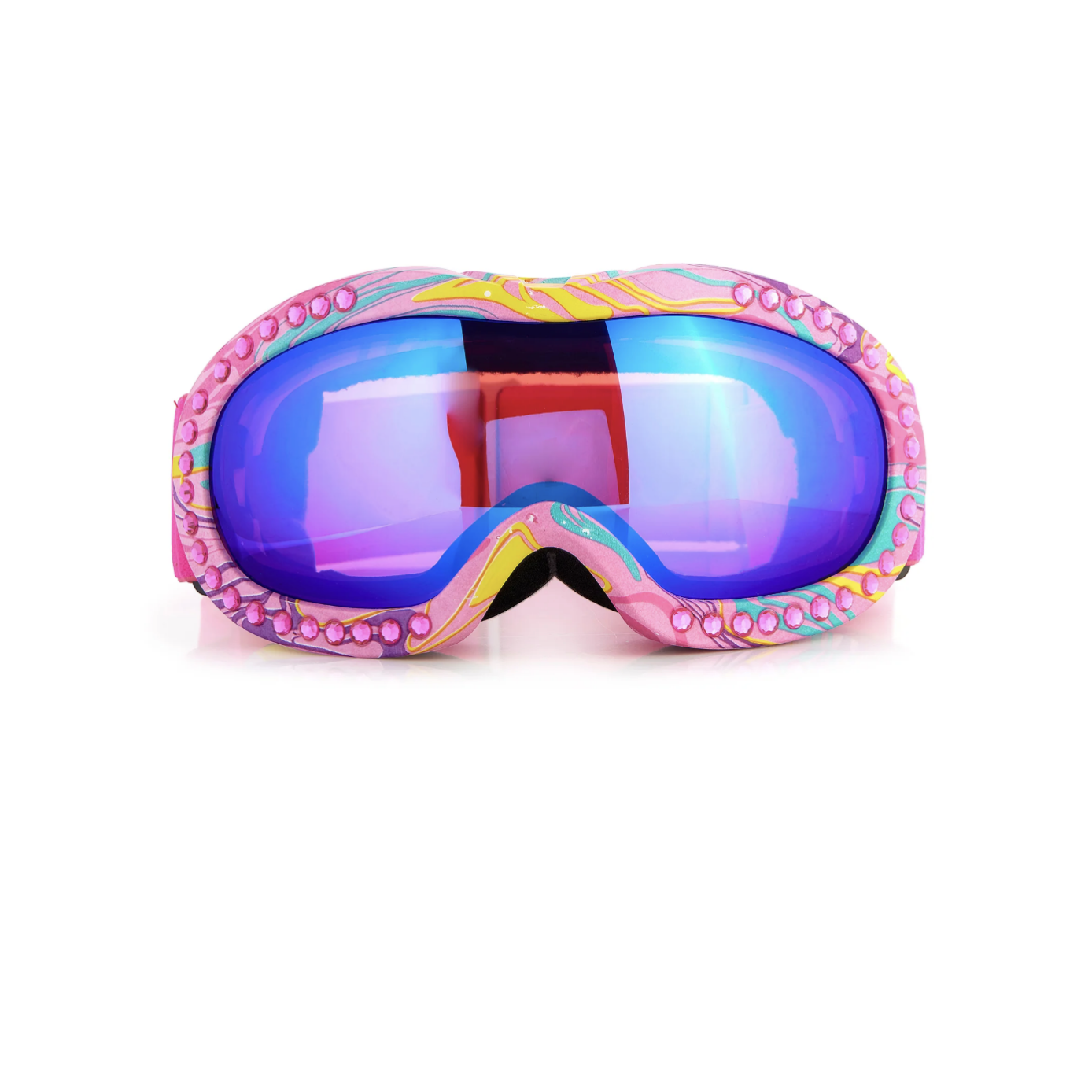 Wind fluttering lifting the snow into dancing swirls of white, sparkle alongside it in Swirls of Taffy Ski Mask. Swirls of Taffy features a delicate tie-dye of colors and a frame bordered in blush pink rhinestones. This ski goggle is finished with an icy-cool pink reflective lens.