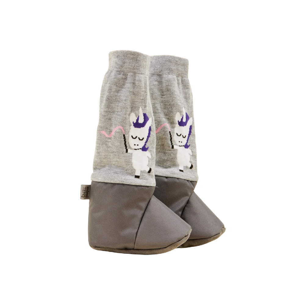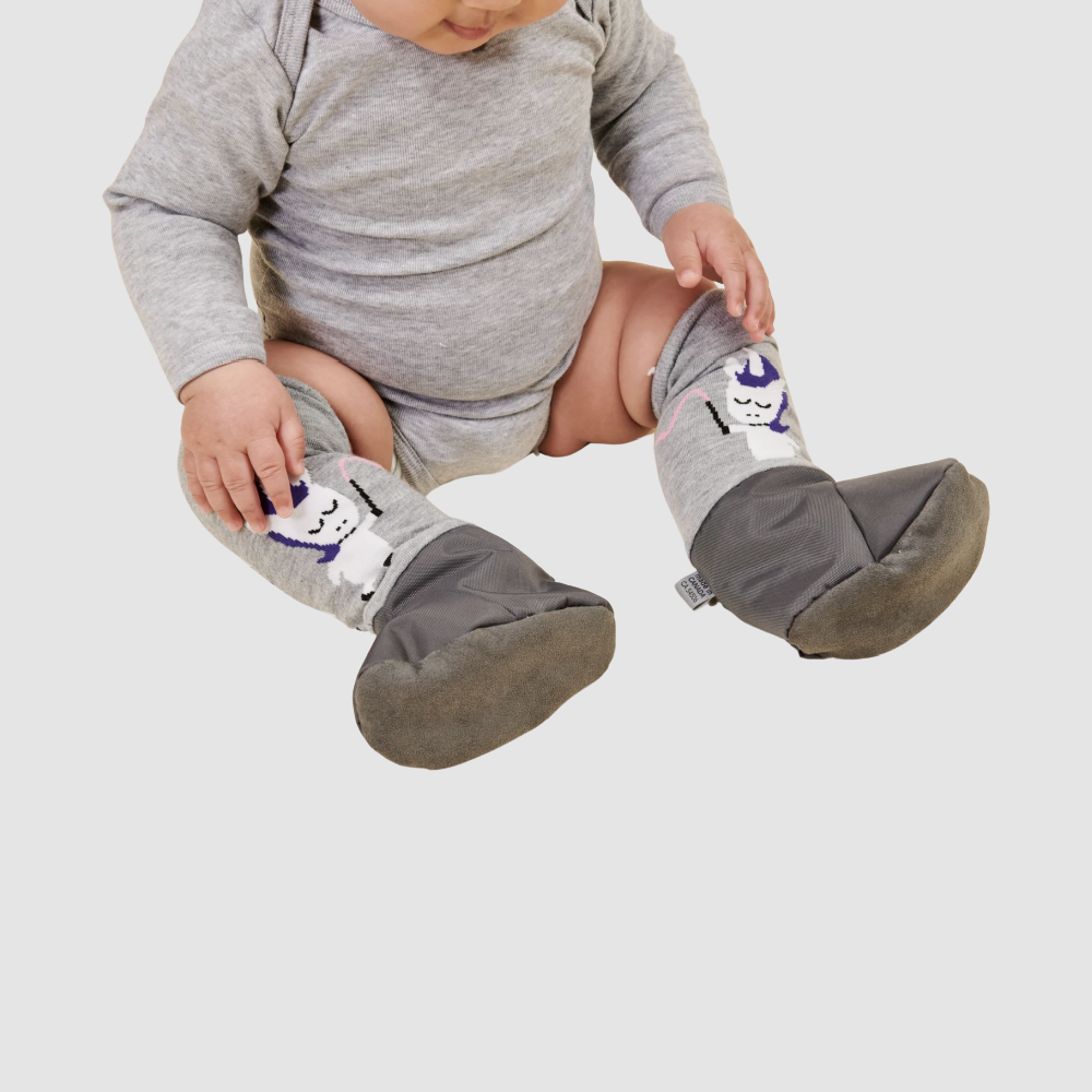 These adorable booties are designed to stay on with no strings attached. Keep in mind they are not a snow boot, but they are water repellent! Designed with baby wearers in mind, they are perfect for being in the stroller and even around the house.