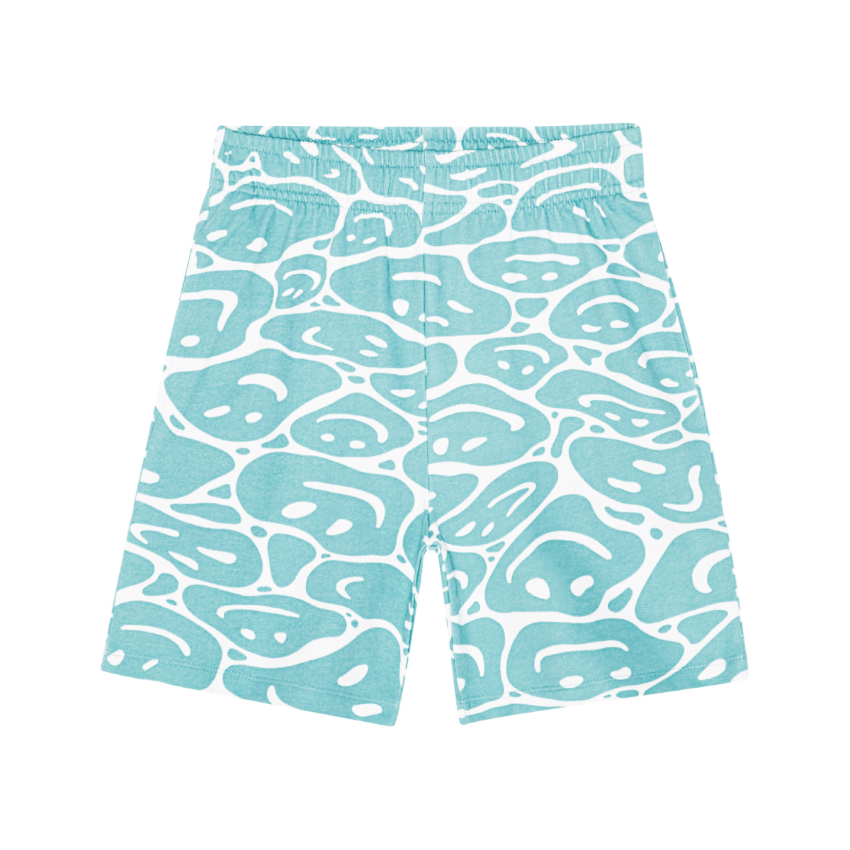 These cotton shorts that feature an all over wavy smiley face in blue and white. These favorites are baggy, knee length and have side seam pockets and a single pocket on the back.