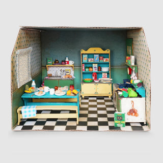 This lovely miniature room is made of durable cardboard and printed on all sides with the characteristic wallpapers and floors of The Mouse Mansion. The 3 sided room features 1 side open and is easy to assemble thanks to the handy flaps and included double-sided tape.