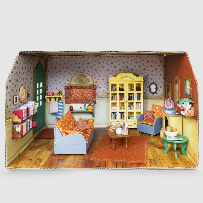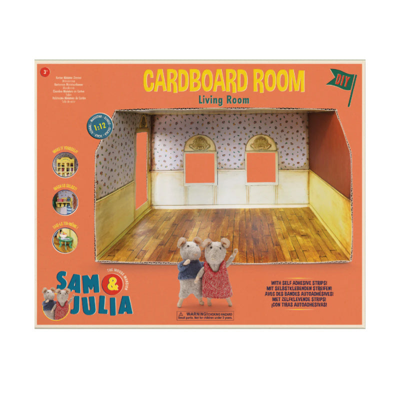 This lovely miniature room is made of durable cardboard and printed on all sides with the characteristic wallpapers and floors of The Mouse Mansion. The 3 sided room features 1 side open and is easy to assemble thanks to the handy flaps and included double-sided tape.