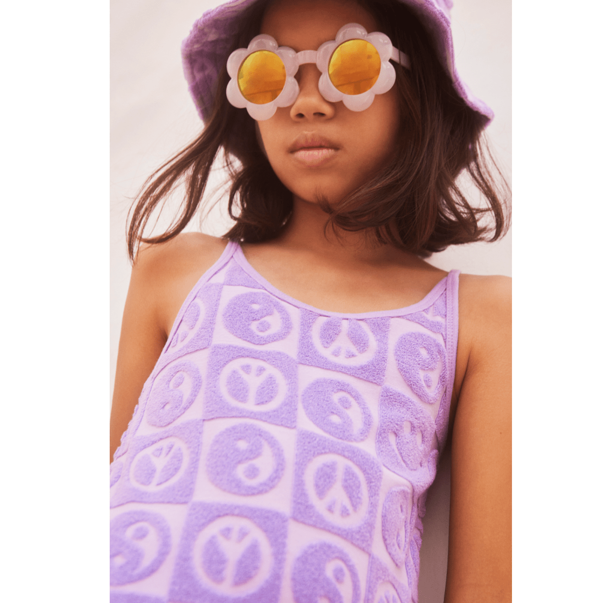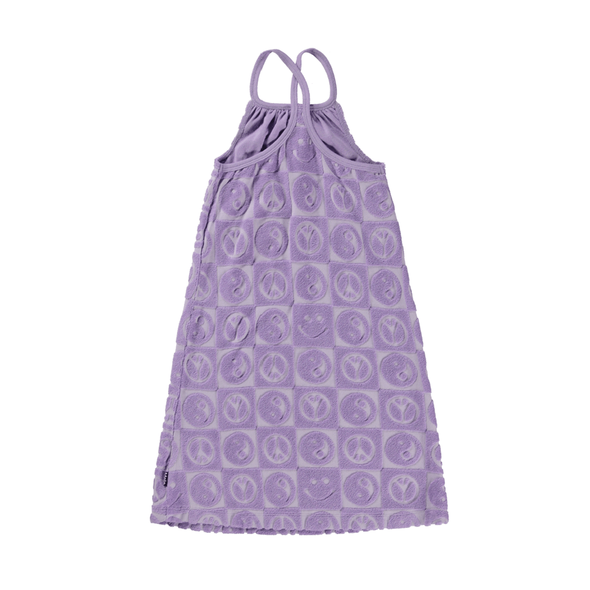 A beautiful and chic strap terry dress featuring an all over yin yang and peace sign with a surprise happy face in a textured design with a cross strap on the back. Lightweight and definitely created to bring on the smiles. A great vacation piece as a swim cover up, or layer with your favorite long sleeve and leggings.