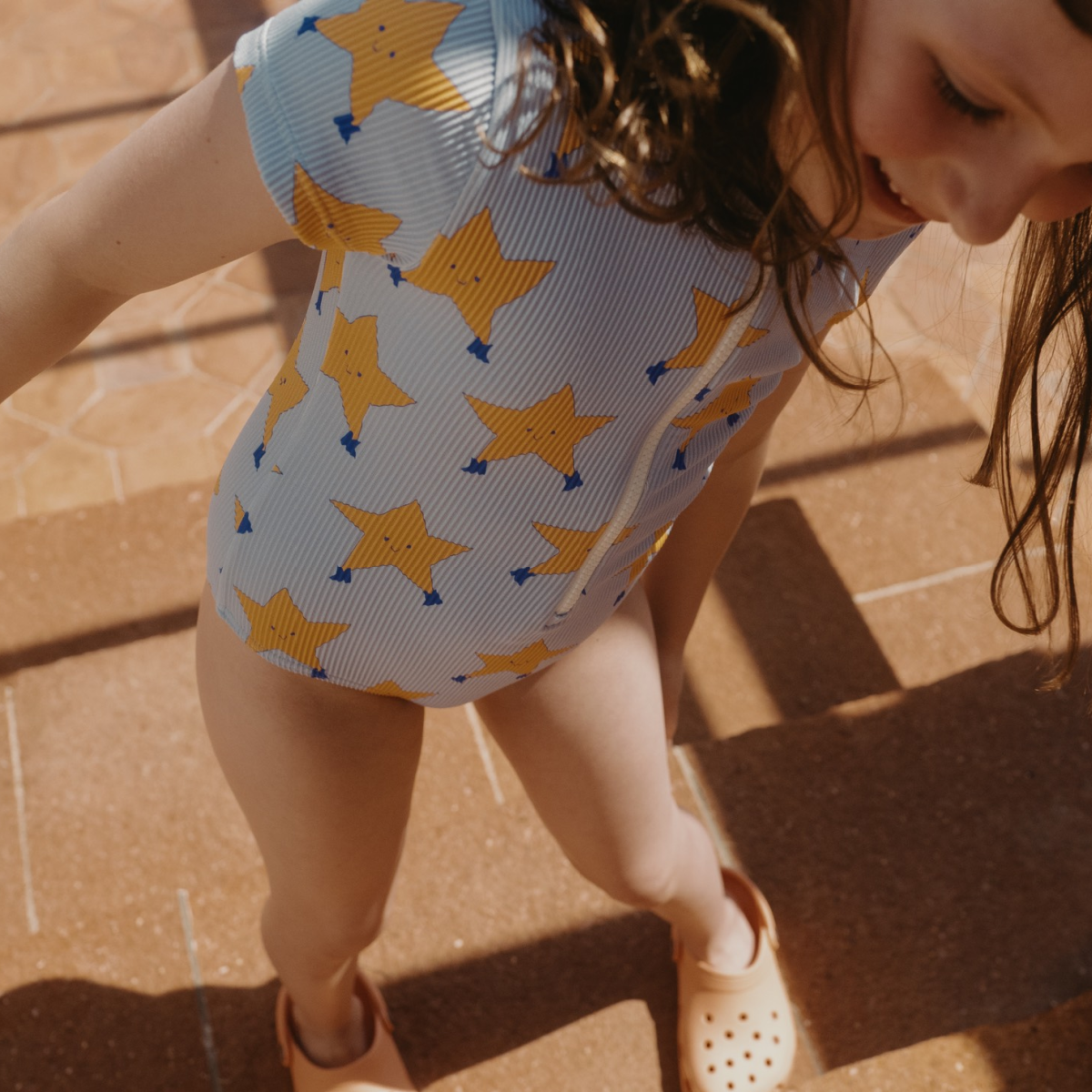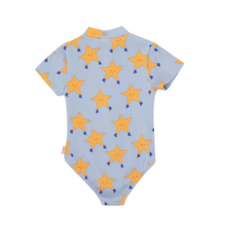 This Dancing Stars Swimsuit in a rib fabric is a fun piece with classic straight fit and frill detail on the legs. The playful dancing stars shine against the blue-grey base. Your little one will adore this comfy and durable swimsuit for sunny days at the pool or fun days at the beach.