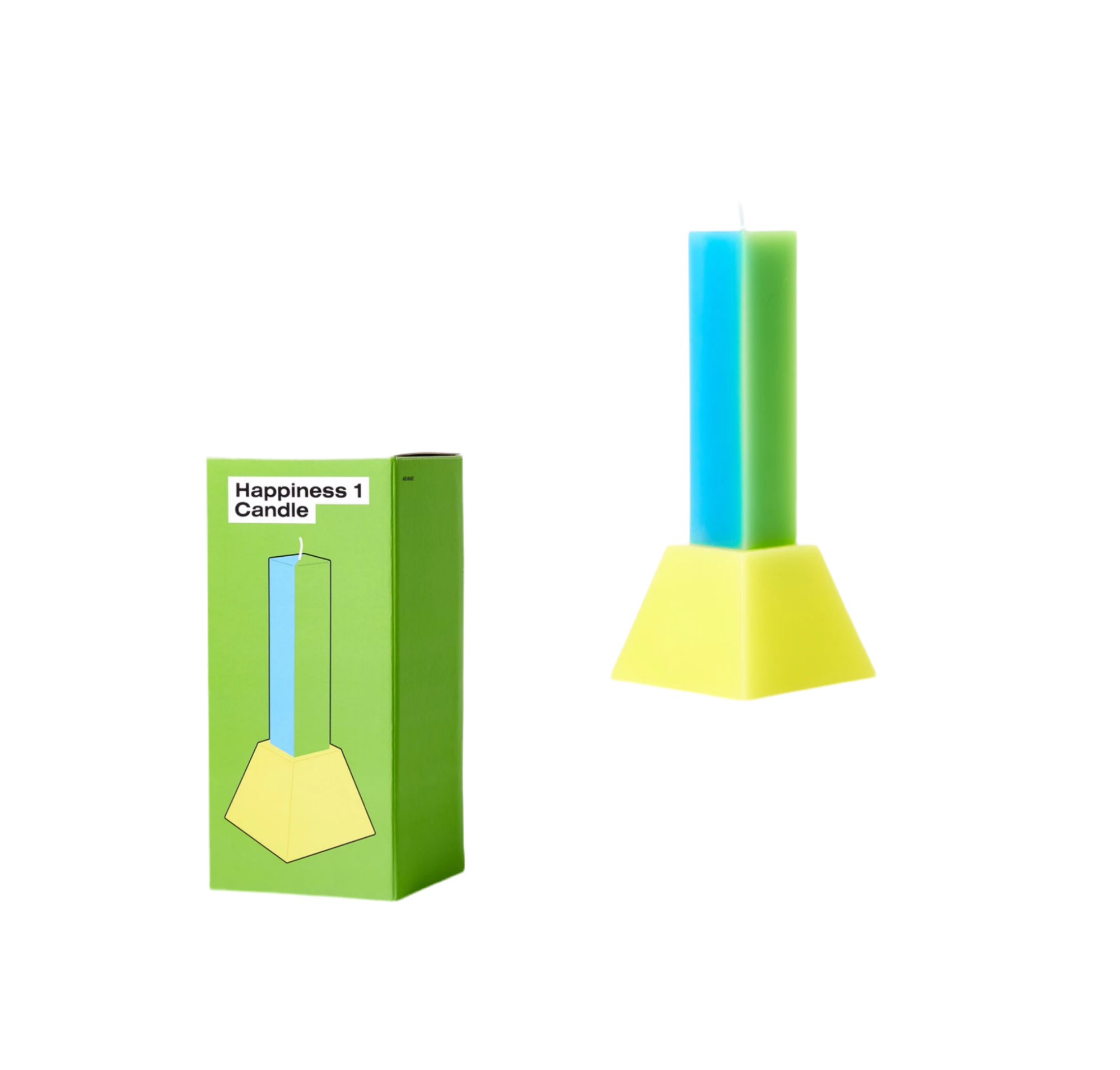 This candle is adapted from designer Yinka Ilori's chair series, Types of Happiness. Each chair in the series tells a story of the sixteen different types of happiness. These stories continue through the pillar candles by replicating the colors used on the chair legs, each of which evoke a type of happy feeling.