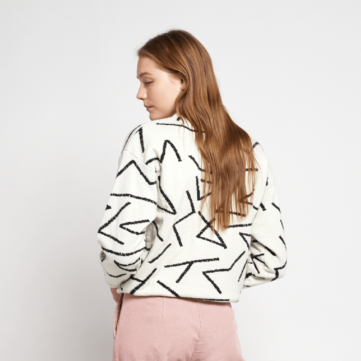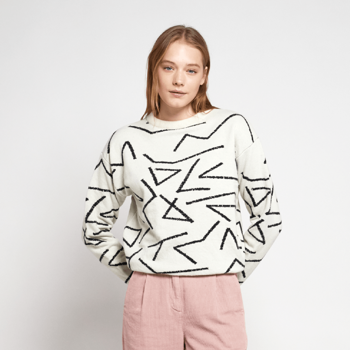 A modern sweater featuring an abstract black print on a white base, scoop neck and chic overall design.