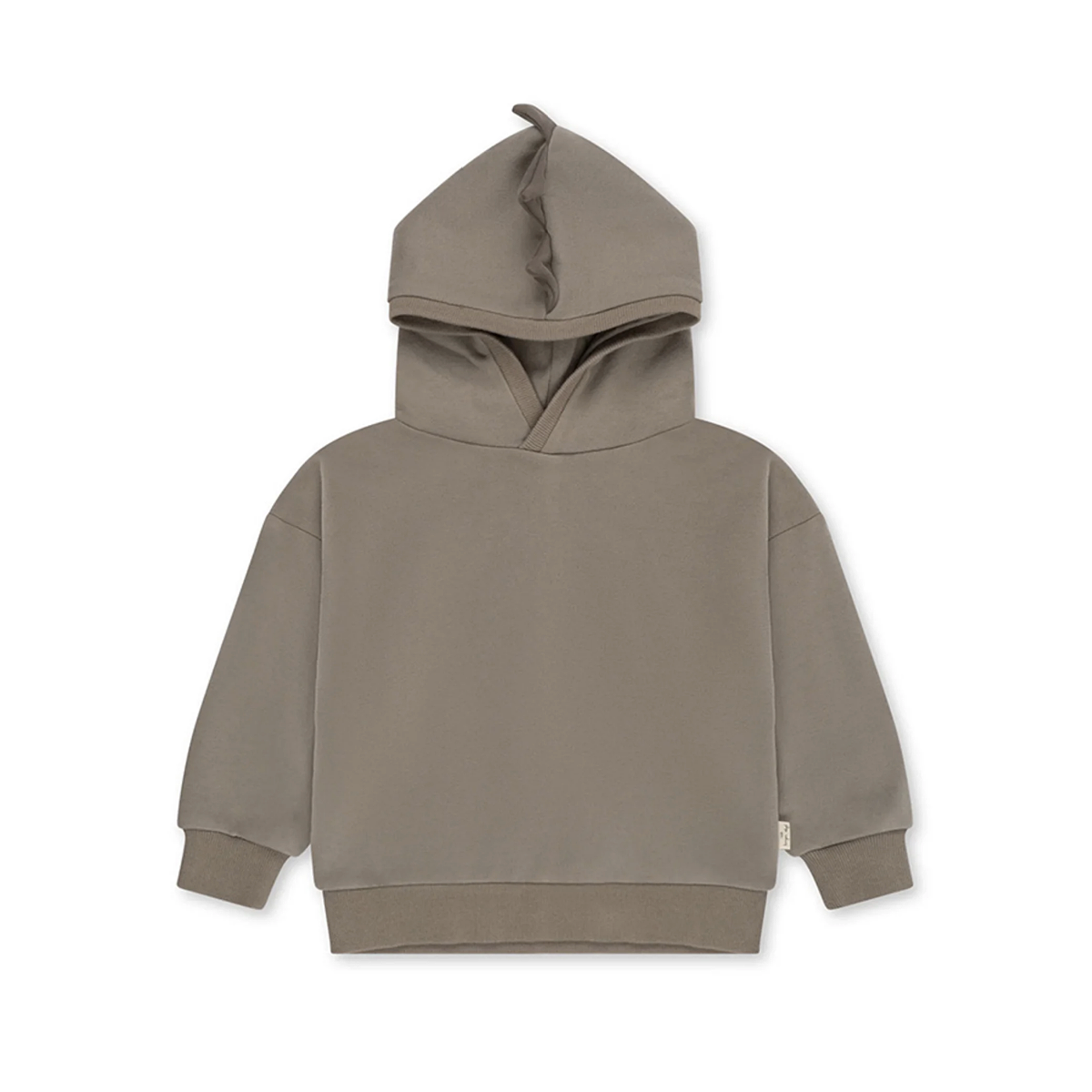 A soft and unique hooded sweatshirt featuring a dinosaur design on the hood and backside in a muted brown color.