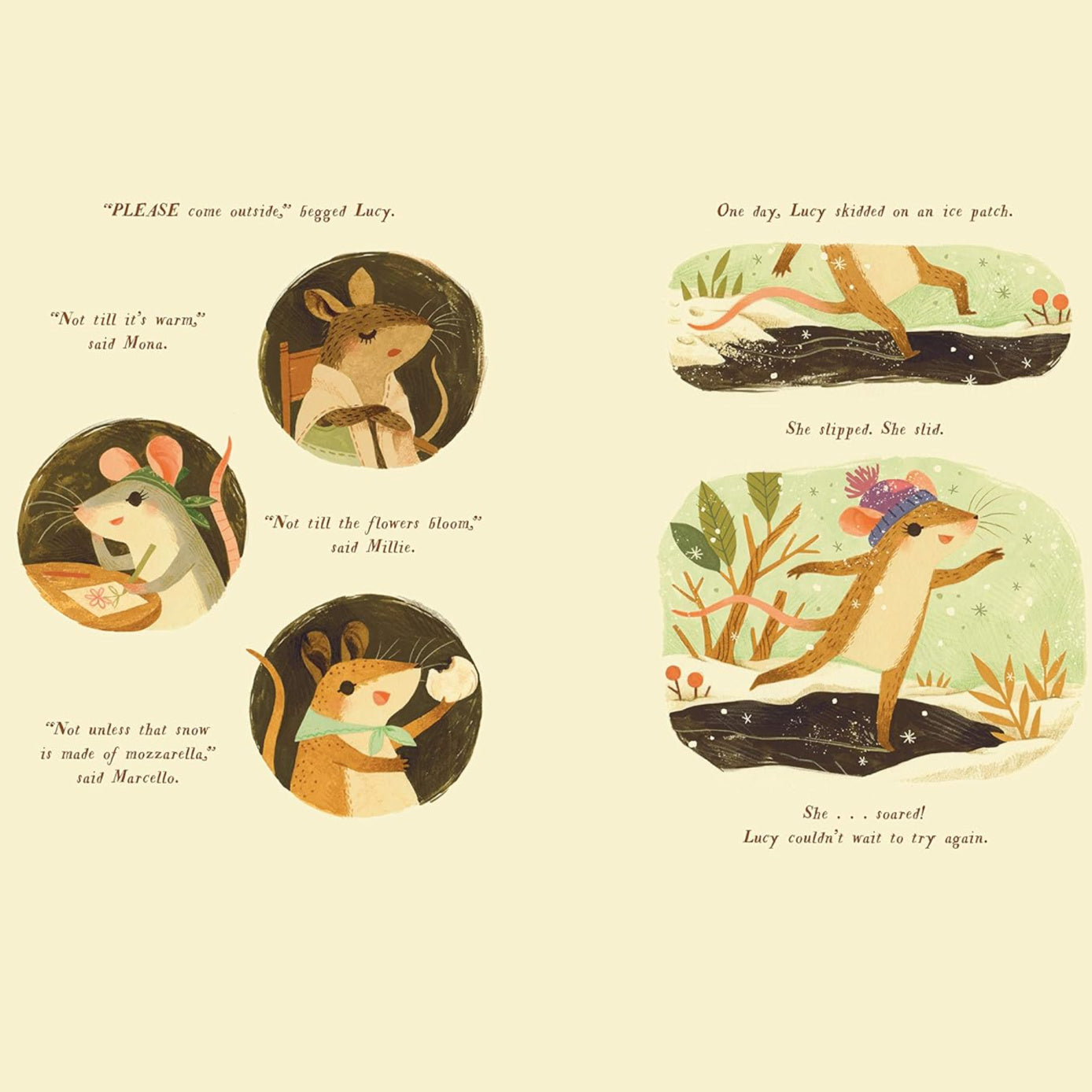This mouse doesn't want to stay in the house . . . even if it's cold outside! For most field mice, winter means burrowing down and snuggling in. But not for Lucy! She loves snow crunching under her paws and wearing a fluffy wool hat. And most of all, Lucy loves to skate, and she's just ACHING to show off her new skill with her friends.