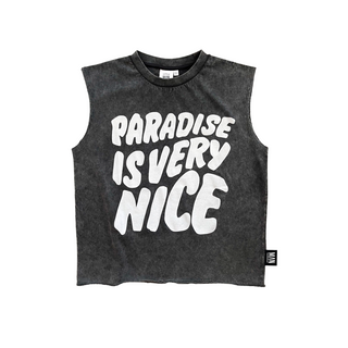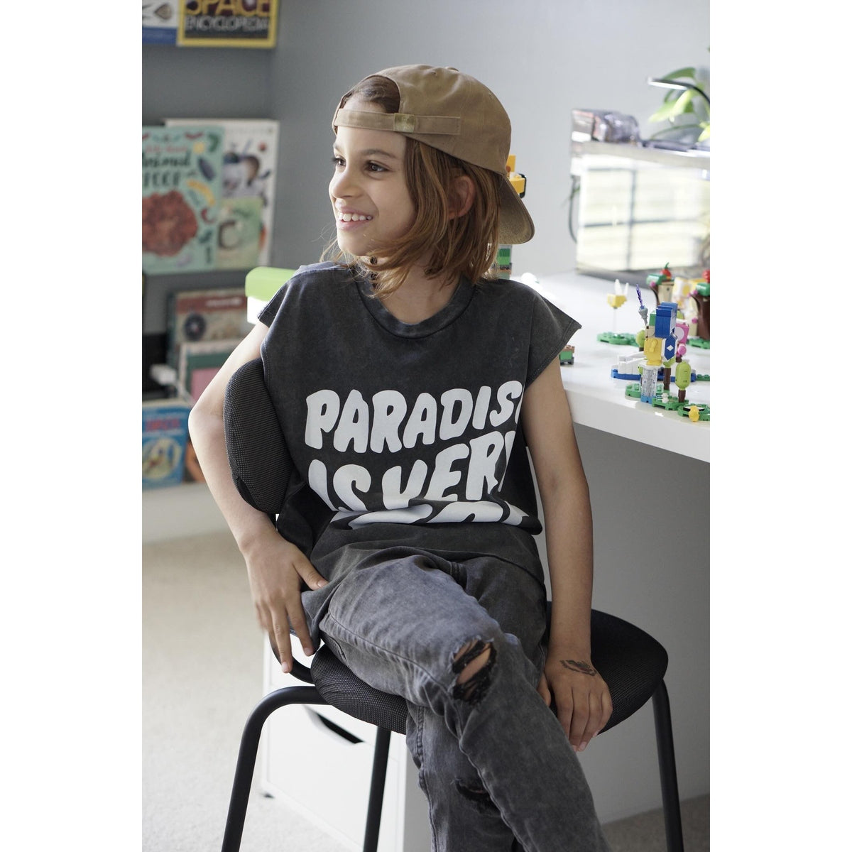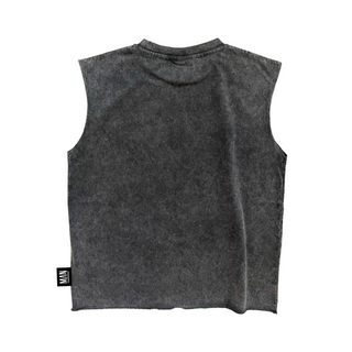 A soft, comfortable loose fitting tank top tee shirt featuring a print on the front in a vintage grey color. Designed for boys and girls.